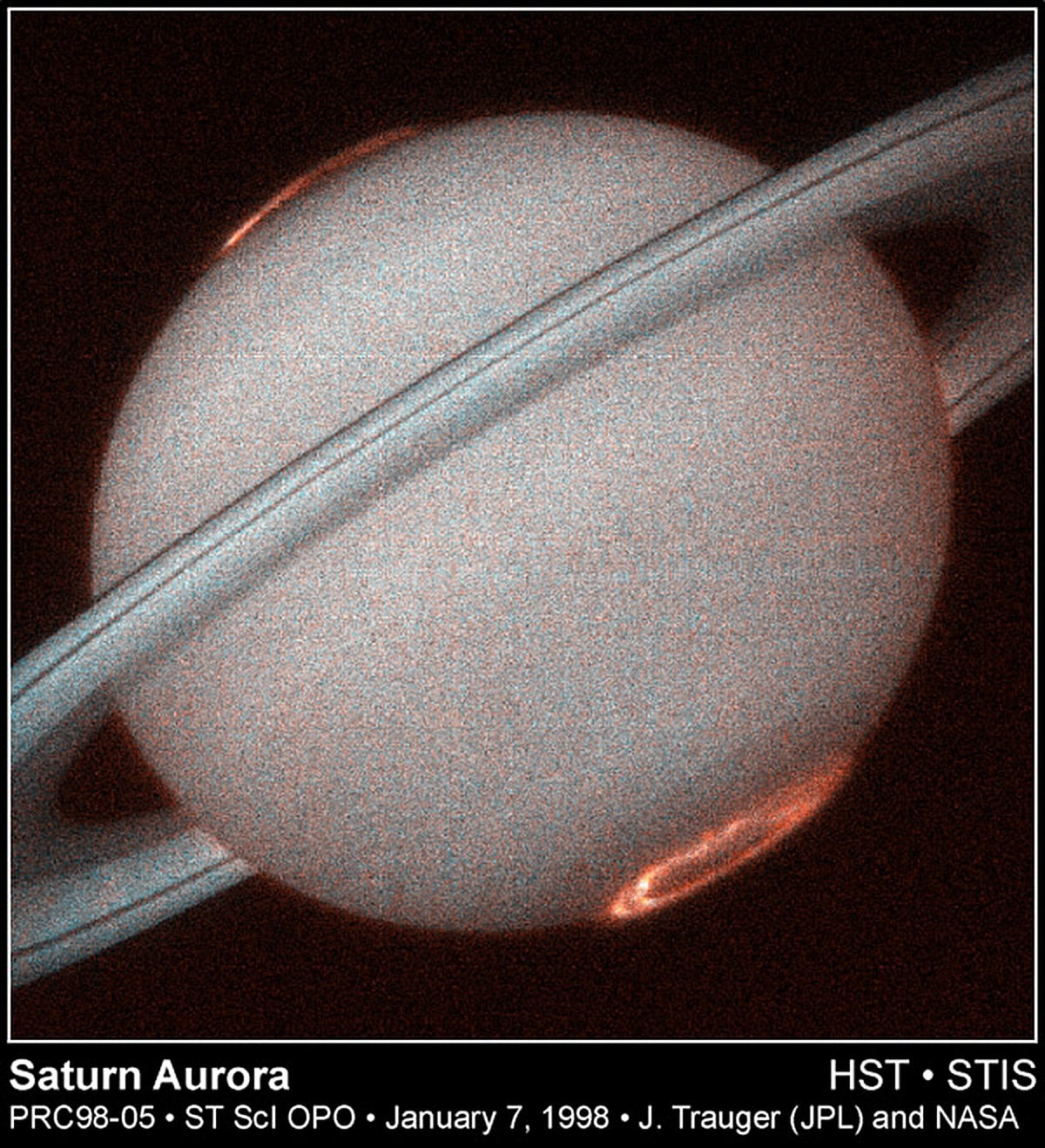 Saturn's Rings are one of the most spectacular sights in the solar system. Still, this image from the Hubble Space Telescope offers a striking view of another kind of ring around Saturn - pole encircling rings of ultraviolet aurora. Towering more than 1,000 miles above the cloud tops, these Saturnian auroral displays were thought to be analogous to Earth's. But following the ebb and flow of Saturn's aurora, with the Hubble's cameras and instruments onboard the Cassini spacecraft, researchers are now reporting some surprising results. In this false-color image made in ultraviolet light, the dramatic red aurora identify emission from atomic hydrogen, while the more concentrated white areas are due to hydrogen molecules.