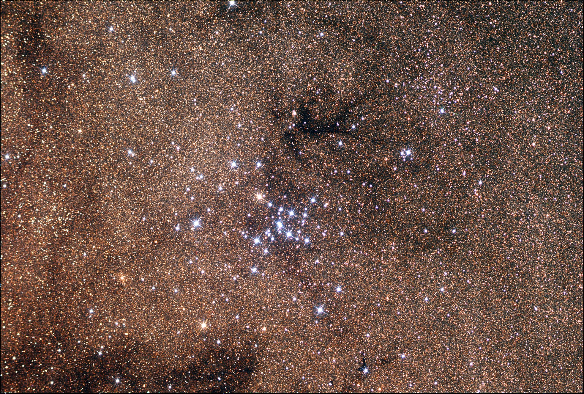 M7 is one of the most prominent open clusters of stars on the sky. The cluster, dominated by bright blue stars, can be seen with the naked eye in a dark sky in the tail of the constellation of Scorpius. M7 contains about 100 stars in total, is about 200 million years old, spans 25 light-years across, and lies about 1000 light-years away. This color picture was taken recently at the Kitt Peak National Observatory in Arizona, USA as part of the Advanced Observers Program. The M7 star cluster has been known since ancient times, being noted by Ptolemy in the year 130 AD. Also visible is a dark dust cloud near the bottom of the frame, and literally millions of unrelated stars towards the Galactic center.
