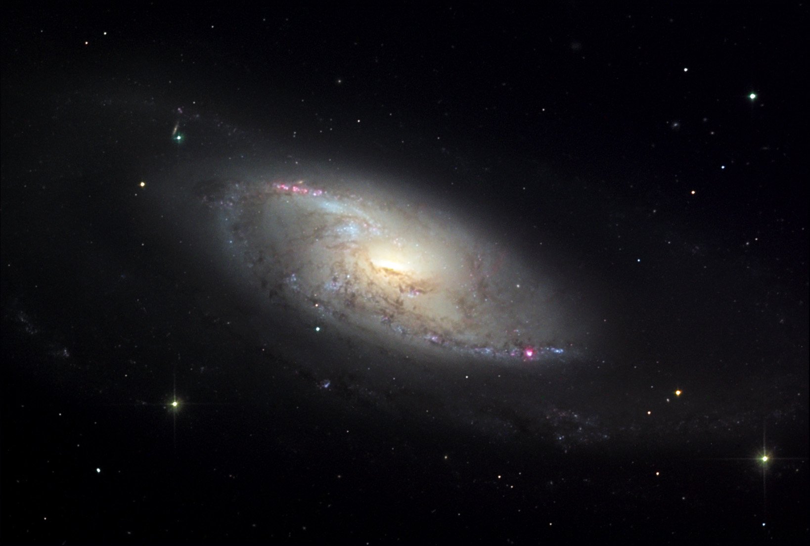 Büyük Ayı'ya (Ursa Major) yakın, Av Köpekleri (Canes Venatici) takımyıldızının yıldızlarıyla çevrili bu gökcismi, 1781 yılında Fransız astronom Pierre Mechain tarafından keşfedildi. Daha sonra, arkadaşı ve meslektaşı Charles Messier onu kataloğuna M106 olarak ekledi. Günümüzün derin teleskop görüntüleri, bunun bir ada evren olduğunu gösteriyor: Samanyolu'nun yıldızlarının yaklaşık 20 milyon ışık yılı ötesinde yer alan, çapı yaklaşık 30 bin ışık yılı olan bir sarmal gökada. Genç mavi yıldız kümeleri ve kırmızımsı yıldız doğumevleri, M106'nın çarpıcı sarmal kollarını belirginleştiriyor. Bu güzel görüntüde açıkça görüldüğü gibi, gökadanın parlak çekirdeği de radyo dalgalarından X-ışınlarına kadar tayfın her yanında kendini gösterir. Bu da M106'yı, etkin gökadaların Seyfert sınıfına yakın bir örnek yapar. Bir Seyfert gökadasının parlak çekirdeğinin, büyük bir merkezî kara deliğe doğru düşen maddeyle beslendiği düşünülür.