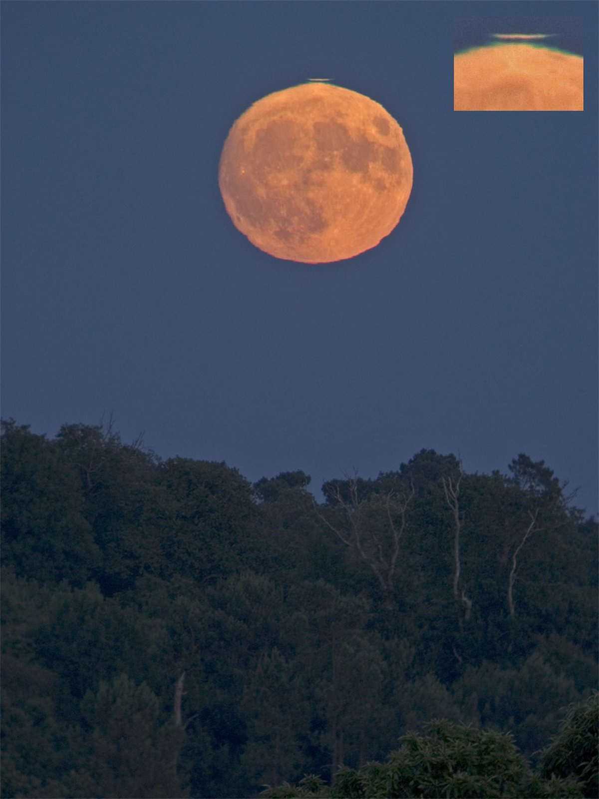 July's Full Moon looks strangely darkened and distorted in this remarkable telescopic view. The image is one of a series recorded when the Moon was very near the horizon. The long sight-line through a turbulent atmosphere gives rise to the tantalizing optical effects, including the thin "mirage" shape that seems to float just above the Moon's upper edge. Also seen (more easily in the inset), along the Moon's upper edge is a noticeable green rim. Substantial atmospheric refraction produces this prism-like effect -- related to the more commonly witnessed green flash of the setting Sun. Careful inspection of the full image reveals a corresponding red rim along the lower edge, another intriguing signature of atmospheric refraction.