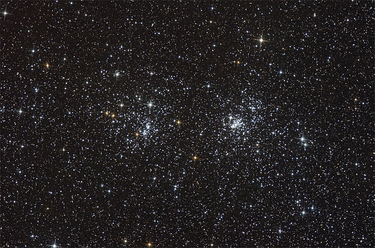 Most star clusters are singularly impressive. Open clusters NGC 869 and NGC 884, however, are doubly impressive. Also known as "h and chi Persei", this unusual double cluster, shown above, is bright enough to be seen from a dark location without even binoculars. Although their discovery surely predates written history, the Greek astronomer Hipparchus notably cataloged the "double cluster". The clusters are over 7,000 light years distant toward the constellation of Perseus, but are separated by only hundreds of light years.
