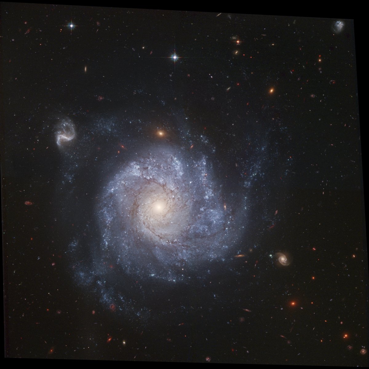 A gorgeous spiral galaxy some 100 million light-years distant, NGC 1309 lies on the banks of the constellation Eridanus. NGC 1309 spans about 30,000 light-years, one third the size of our larger Milky Way galaxy. Bluish clusters of young stars and dust lanes are seen to trace out NGC 1309's spiral arms as they wind around an older yellowish star population at its core. Not just another pretty face-on spiral galaxy, observations of NGC 1309's recent supernova and cepheid stars contribute to the calibration of the expansion of the Universe. Still, after you get over this beautiful galaxy's grand design, check out the array of more distant background galaxies also recorded in the sharp Hubble Space Telescope view.