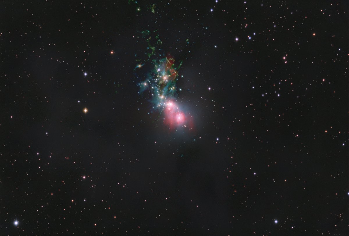 Dusty NGC 1333 is seen in visible light as a reflection nebula, dominated by bluish hues characteristic of starlight reflected by dust. But at longer infrared wavelengths, the interstellar dust itself glows. Moving your cursor over the picture will match up a visible light view with a false-color infrared image of the region from the Spitzer Space Telescope. The penetrating infrared view unmasks youthful stars that are otherwise obscured by the dusty clouds that formed them. Also revealed are greenish streaks and splotches that seem to litter the region. The structures trace the glow of cosmic jets blasting away from emerging young stellar objects and plowing into the cold cloud material. In all, the chaotic environment likely resembles one in which our own Sun formed over 4.5 billion years ago. NGC 1333 is a mere 1,000 light-years distant in the constellation Perseus.
