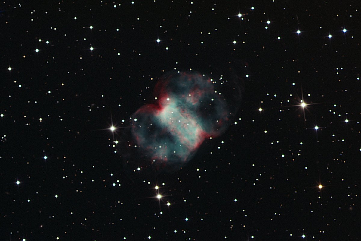 "Nebula at the right foot of Andromeda ... " begins the description for the 76th object in Charles Messier's 18th century Catalog of Nebulae and Star Clusters. In fact, M76 is one of the fainter objects on the Messier list and is also known by the popular name of the "Little Dumbbell Nebula". Like its brighter namesake M27 (the Dumbbell Nebula), M76 is recognized as a planetary nebula - a gaseous shroud cast off by a dying sunlike star. The nebula itself is thought to be shaped more like a donut, while its box-like appearance is due to our nearly edge-on view. Gas expanding more rapidly away from the donut hole produces the faint loops of far flung material. The nebula's dying star can be picked out in this sharp color image as the bottom, blue-tinted member of the double star near the center of the box-like shape. Distance estimates place M76 about 3 to 5 thousand light-years away, making the nebula over a light-year in diameter.