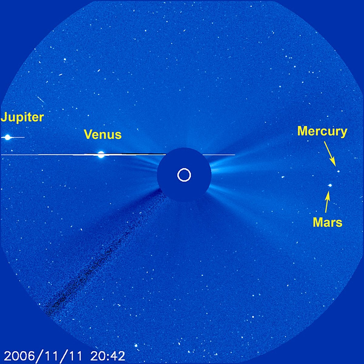 The sight of Mercury's tiny round disk drifting slowly across the face of the Sun inspired and entertained many denizens of planet Earth last week. In fact, artist and astronomer Mark Seibold viewed both the 1999 and 2006 transits of the solar system's innermost planet through solar filtered telescopes and composed this rendering of Mercury "hovering in the photosphere" near the edge of an enormous solar disk. The original work is a 23 by 17 inch pastel sketch. While the artist's hand is creatively superimposed, Seibold concentrated on offering an impression of Mercury's silhouette, surrounded by shadings reflecting his visual experience that are not easily captured in photographic exposures. Of course, before the age of cameras drawings were more widely used to record telescopic observations of sunspots and planetary transits.