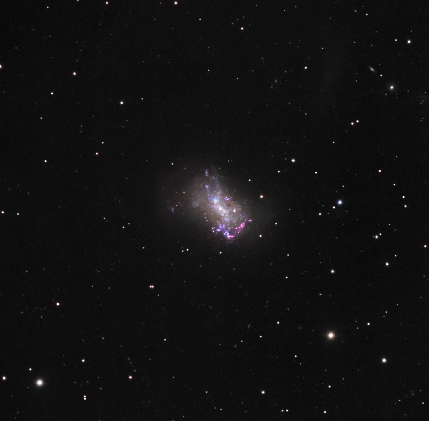 Grand spiral galaxies often seem to get all the glory. Their newly formed, bright, blue star clusters along beautiful, symmetric spiral arms are guaranteed to attract attention. But small irregular galaxies form stars too, like NGC 4449, located about 12 million light-years away. The well-studied galaxy is similar in size, and often compared to our Milky Way's satellite galaxy, the Large Magellanic Cloud (LMC). This lovely color image shows NGC 4449's general bar shape, also characteristic of the LMC, with scattered young blue star clusters. Near the bottom is the pinkish glow of atomic hydrogen gas, the telltale tracer of massive star forming regions. NGC 4449 is a member of a group of galaxies found in the constellation Canes Venatici. In fact, interactions with nearby galaxies are thought to have influenced star formation in NGC 4449.