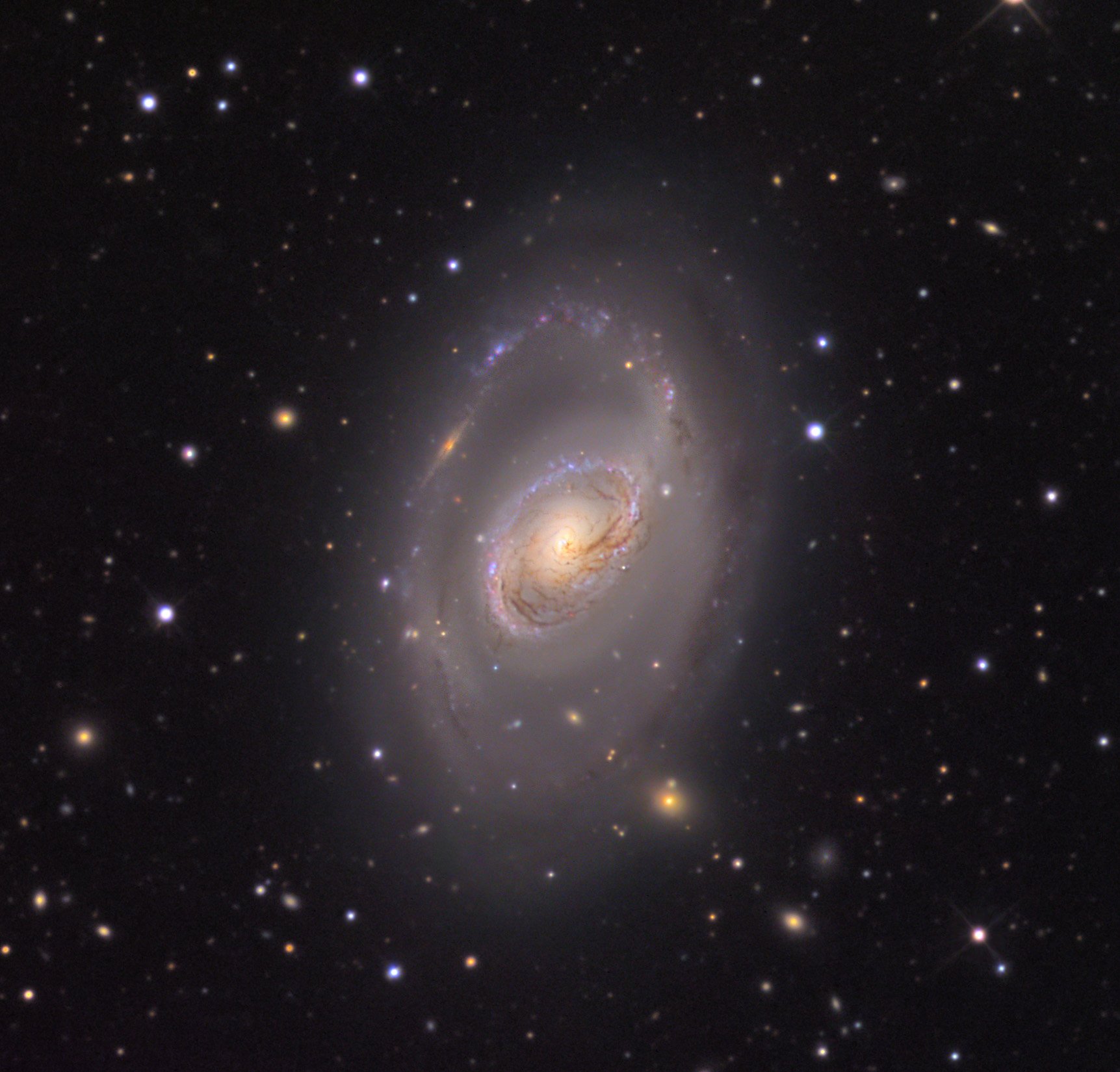Dust lanes seem to swirl around the core of Messier 96 in this colorful, detailed portrait of the beautiful island universe. Of course M96 is a spiral galaxy, and counting the faint arms extending beyond the brighter central region it spans 100 thousand light-years or so, about the size of our own Milky Way. M96 is known to be 38 million light-years distant, a dominant member of the Leo I galaxy group. Background galaxies and smaller Leo I group members can be found by examining the picture, but accomplished astro-imager Adam Block notes he is most intrigued by the edge-on spiral galaxy that apparently lies behind the outer spiral arm near the 10 o'clock position. The edge-on spiral appears to be about 1/5 the size of M96. If the spiral is similar in actual size to M96, then it lies about 5 times farther away.
