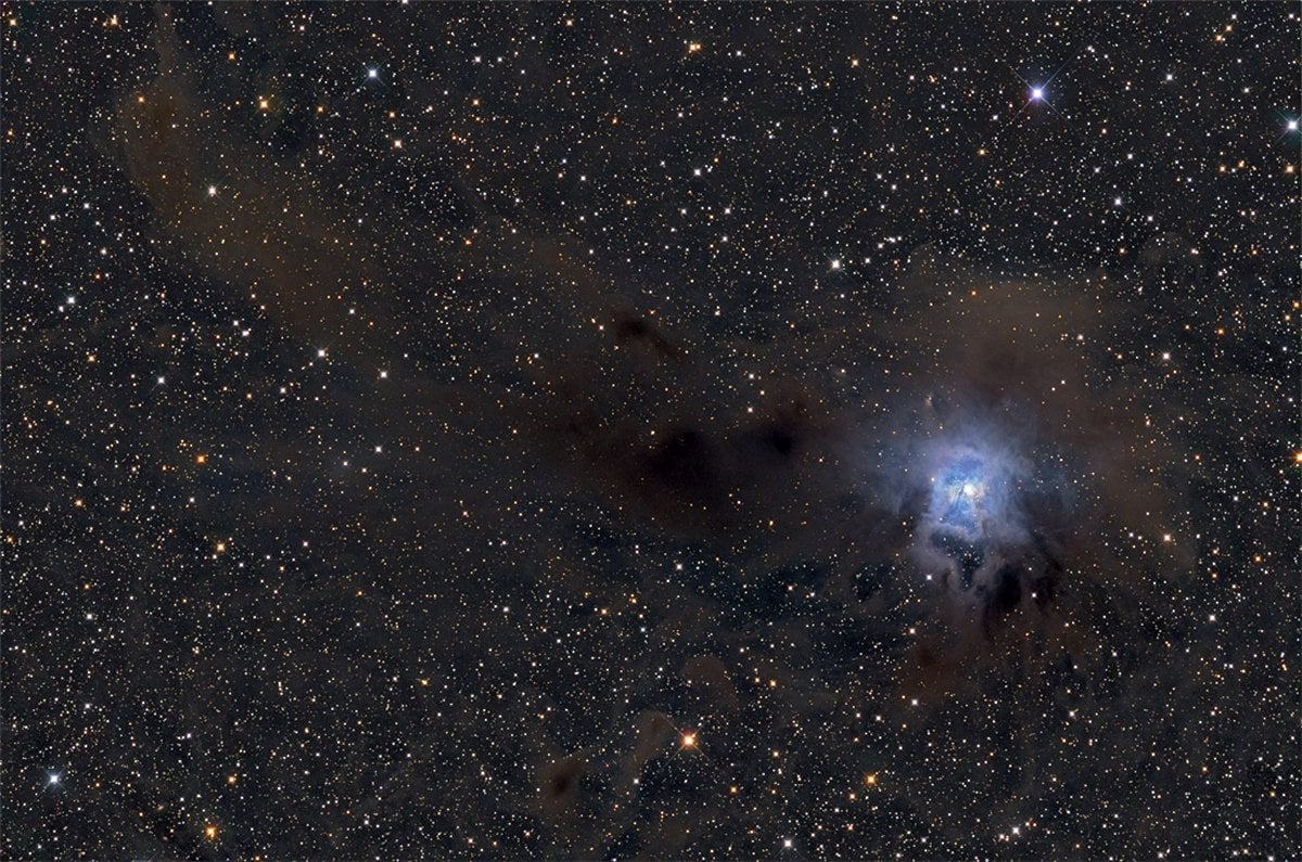 Like delicate cosmic petals, these clouds of interstellar dust and gas have blossomed 1,300 light-years away in the fertile star fields of the constellation Cepheus. Sometimes called the Iris Nebula and dutifully cataloged as NGC 7023, this is not the only nebula in the sky to evoke the imagery of flowers. Still, this beautiful digital image shows off the Iris Nebula's range of colors and symmetries in impressive detail. Within the Iris, dusty nebular material surrounds a massive, hot, young star in its formative years. Central filaments of cosmic dust glow with a reddish photoluminescence as some dust grains effectively convert the star's invisible ultraviolet radiation to visible red light. Yet the dominant color of the central nebula is blue, characteristic of dust grains reflecting starlight. Dark, obscuring clouds of dust and cold molecular gas are present on the left of the image, and lead the eye to see other convoluted and fantastic shapes. Infrared observations indicate that this nebula may contain complex carbon molecules known as PAHs. As shown here, the bright blue portion of the Iris Nebula is about six light-years across.