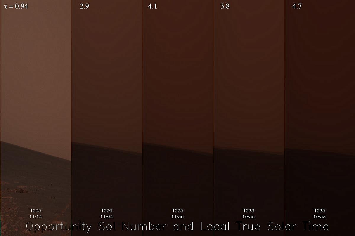 Will global dust storms terminate the robotic Martian rovers? Over the past month, windy dust storms have blocked much needed sunlight from reaching the solar panels of both the Spirit and Opportunity rovers exploring Mars. At times, as much as 99 percent of direct sunlight has been obscured, causing worry that the batteries might run out of energy before the storms end -- which may be as long as weeks. In an effort to weather these storms, Earth controllers have programmed the rovers to restrict movements and to use as little power as possible. Although the rovers have been working for a remarkable three years past their planned three month lifetimes, their immediate future is now uncertain. Pictured above, the Opportunity rover perched on the edge of Victoria Crater peered for a month into the distance as dust made the Martian air increasingly opaque.