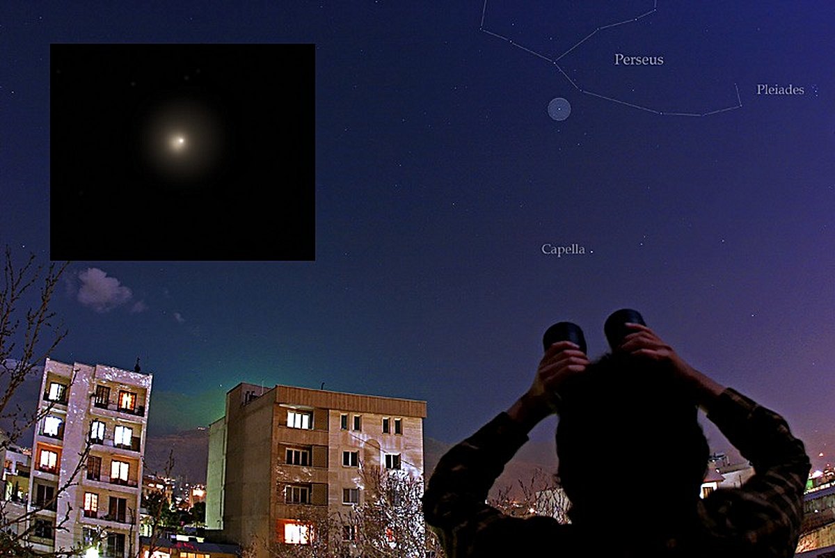 Comet 17P/Holmes stunned comet watchers across planet Earth earlier this week. On October 24, it increased in brightness over half a million times in a matter of hours. The outburst transformed it from an obscure and faint comet quietly orbiting the Sun with a period of about 7 years to a naked-eye comet rivaling the brighter stars in the constellation Perseus. Recorded on that date, this view from Tehran, Iran highlights the comet's (enhanced and circled) dramatic new visibility in urban skies. The inset (left) is a telescopic image from a backyard in Buffalo, New York showing the comet's greatly expanded coma, but apparent lack of a tail. Holmes' outburst could be due to a sudden exposure of fresh cometary ice or even the breakup of the comet nucleus. The comet may well remain bright in the coming days.