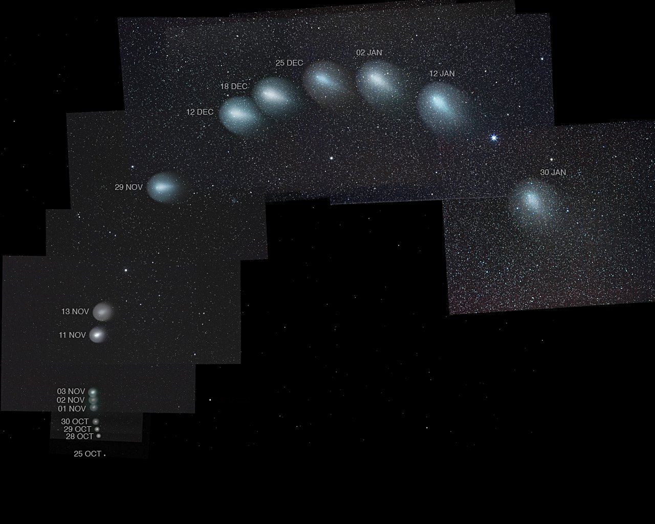 How has Comet Holmes changed? Since brightening unexpectedly by nearly one million fold in late October, the last three months have found the coma of Comet 17P/Holmes both expanding and fading. This spectacular composite image shows how the coma and tail of Comet Holmes have changed. Due to Earth's changing vantage point, Comet Holmes, out beyond the orbit of Mars, was seen in November nearly head-on, but in recent months is seen more from the side. Additionally, the comet's motion, when combined with Earth's changing perspective, has caused the comet to have shifted relative to the background stars. The curved path of Comet Holmes shows it to be undergoing apparent retrograde motion as the Earth orbits quickly in front of it. The extent of the coma currently makes Comet Holmes over five times the physical size of our Sun. Anecdotal evidence holds that the comet is hard to see without long photographic exposures, but on such exposures the comet may still be an impressive sight.