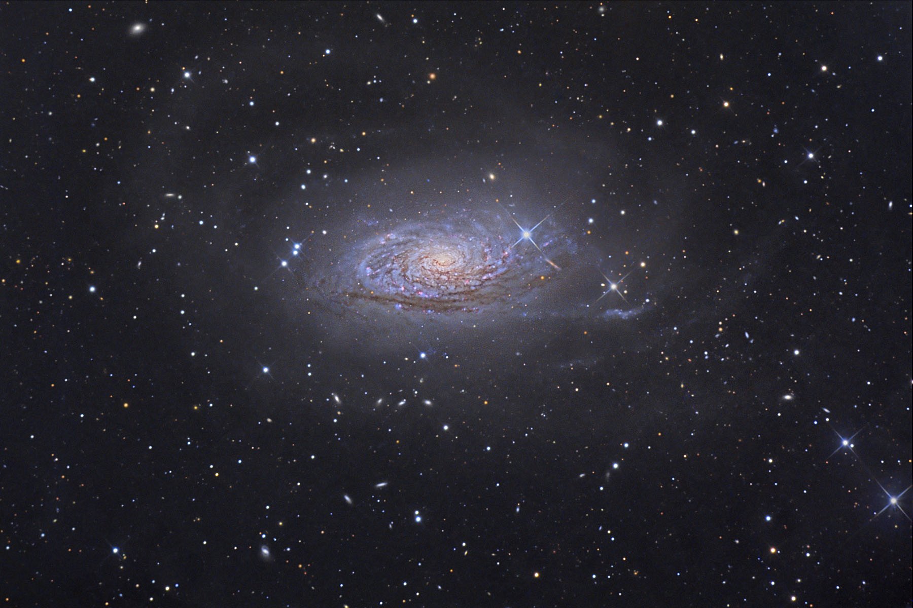 A bright spiral galaxy of the northern sky, Messier 63 is about 25 million light-years distant in the loyal constellation Canes Venatici. Also cataloged as NGC 5055, the majestic island universe is nearly 100,000 light-years across, about the size of our own Milky Way. Known by the popular moniker, The Sunflower Galaxy, M63 sports a bright yellowish core and sweeping blue spiral arms, streaked with cosmic dust lanes and dotted with pink star forming regions. But this deep exposure also shows remarkable faint loops and extensions of the galaxy's spiral arms. A dominant member of a known galaxy group, M63's faint extended features could be the result of gravitational interactions with nearby galaxies. M63 also shines across the electromagnetic spectrum and is thought to have undergone bursts of intense star formation.