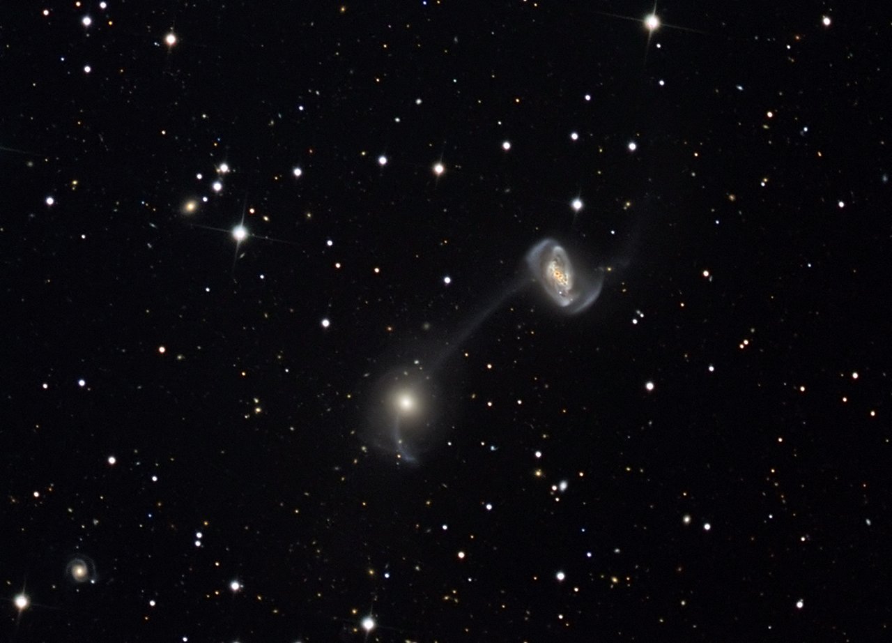 Galaxies NGC 5216 (top right) and NGC 5218 really do look like they are connected by a string. Of course, that string is a cosmic trail of gas, dust, and stars about 22,000 light-years long. Also known as Keenan's system (for its discoverer) and Arp 104, the interacting galaxy pair is some 17 million light-years away in the constellation Ursa Major. The debris trail that joins them, along with NGC 5218's comma-shaped extension and the distorted arms of NGC 5216 are a consequence of mutual gravitational tides that disrupt the galaxies as they repeatedly swing close to one another. Drawn out over billions of years, the encounters will likely result in their merger into a single galaxy of stars. Such spectacular galactic mergers are now understood to be a normal part of the evolution of galaxies, including our own Milky Way.