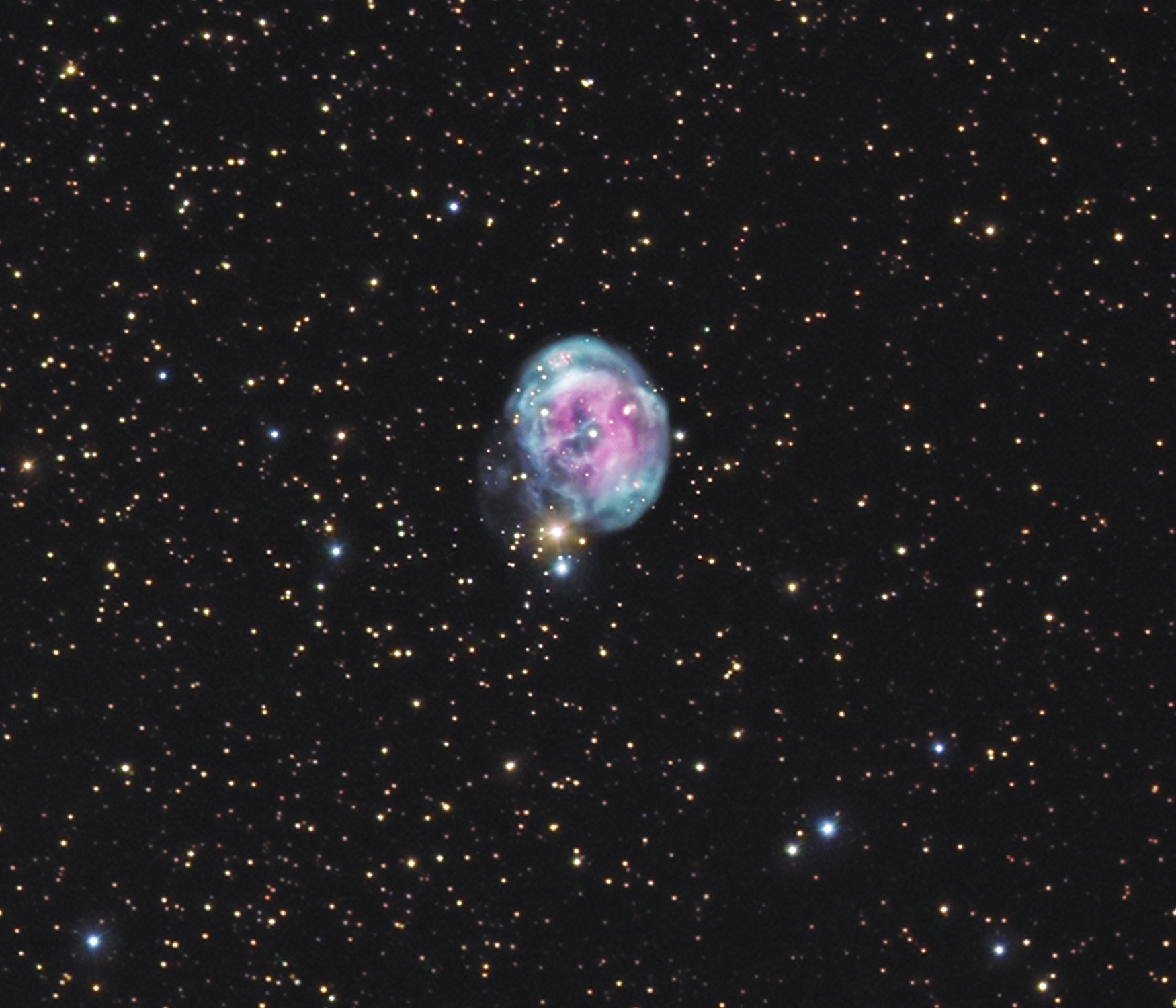 Compact and round, NGC 7008 is recognized as a planetary nebula about 2,800 light-years distant in the nebula rich constellation of Cygnus. This impressive telescopic view shows off NGC 7008's remarkable colors and details by the skillful combination of broad band and narrow band images from two different telescopes with about 12 hours of total exposure time. The intriguing assortment of features within the nebula's approximately 1 light-year diameter suggest its popular name, the Fetus Nebula, but planetary nebulae are not associated with star birth. Instead, nebulae like NGC 7008 are produced during a brief phase that sun-like stars pass through toward the end of their lives. Ejecting their outer layers, the stars cool to eventually become white dwarf stars, like the star seen near the center of NGC 7008. This colorful image also includes an unrelated but still lovely gold and blue binary star system just below NGC 7008.