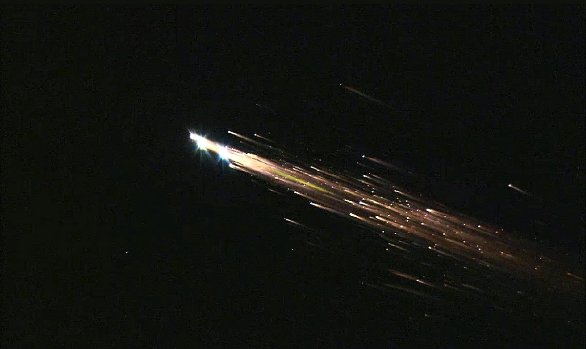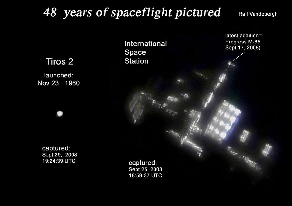 This year, NASA celebrated its 50th anniversary. Inspired to make his own contribution, astronomer Ralf Vandebergh set out to record images of some historic spacecraft in Earth orbit -- captured with his own modest equipment and a hand-guided, 10-inch, Newtonian reflecting telescope. One result is this intriguing composite effectively spanning 48 years of space flight! From a 1960 launch, on the left is the TIROS 2 satellite, one of the first successful weather satellites. While this TIROS (Television InfraRed Observation System) satellite stopped functioning in 1961, Vandebergh notes that if we could visit it now, we would still find video cameras and magnetic tape recorders. On the right, of course, is the ISS (International Space Station) including its recent addition, the Progress M-65 cargo vehicle, launched to the ISS just last month.
