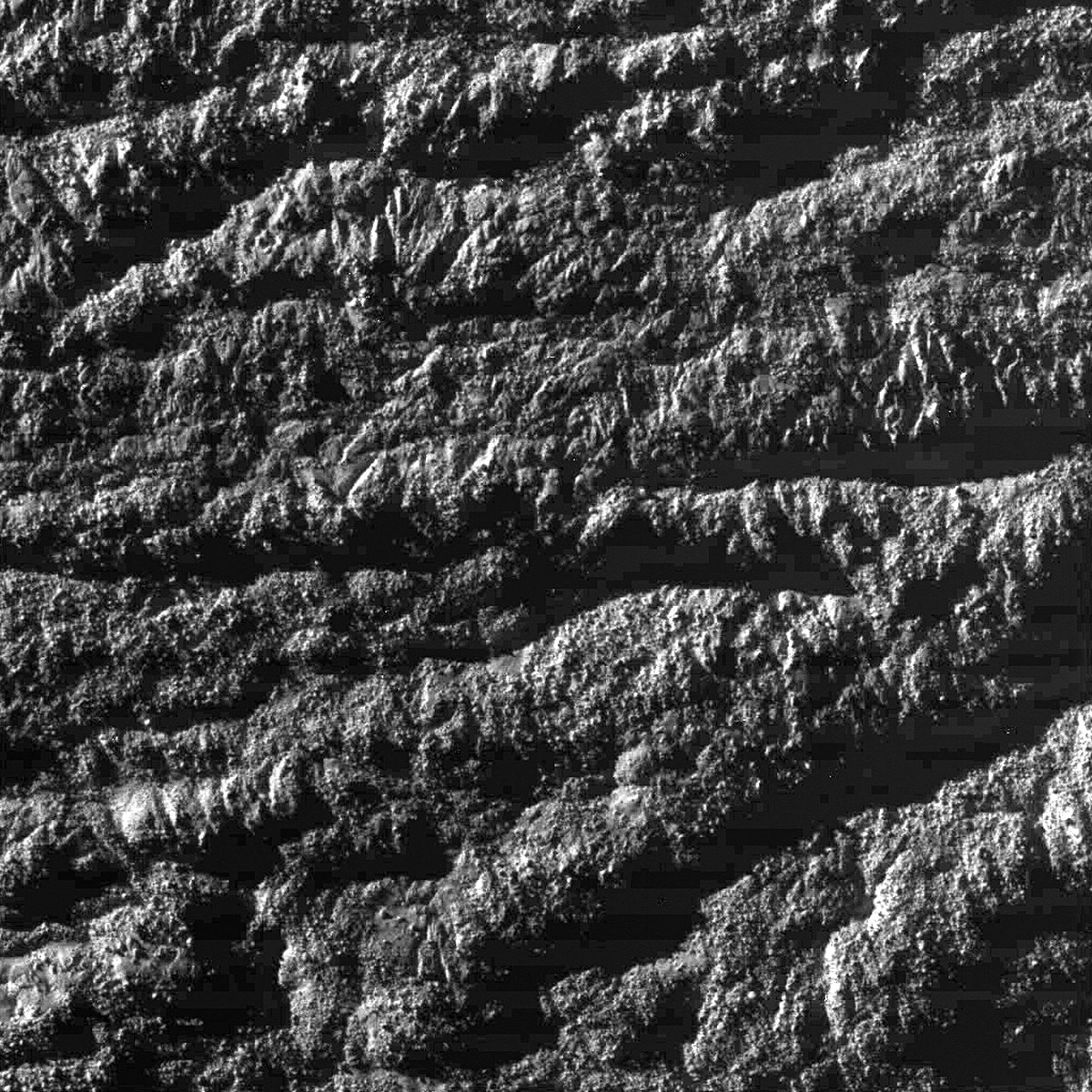grooves and hills dot an alien moonscape devoid of craters. Space