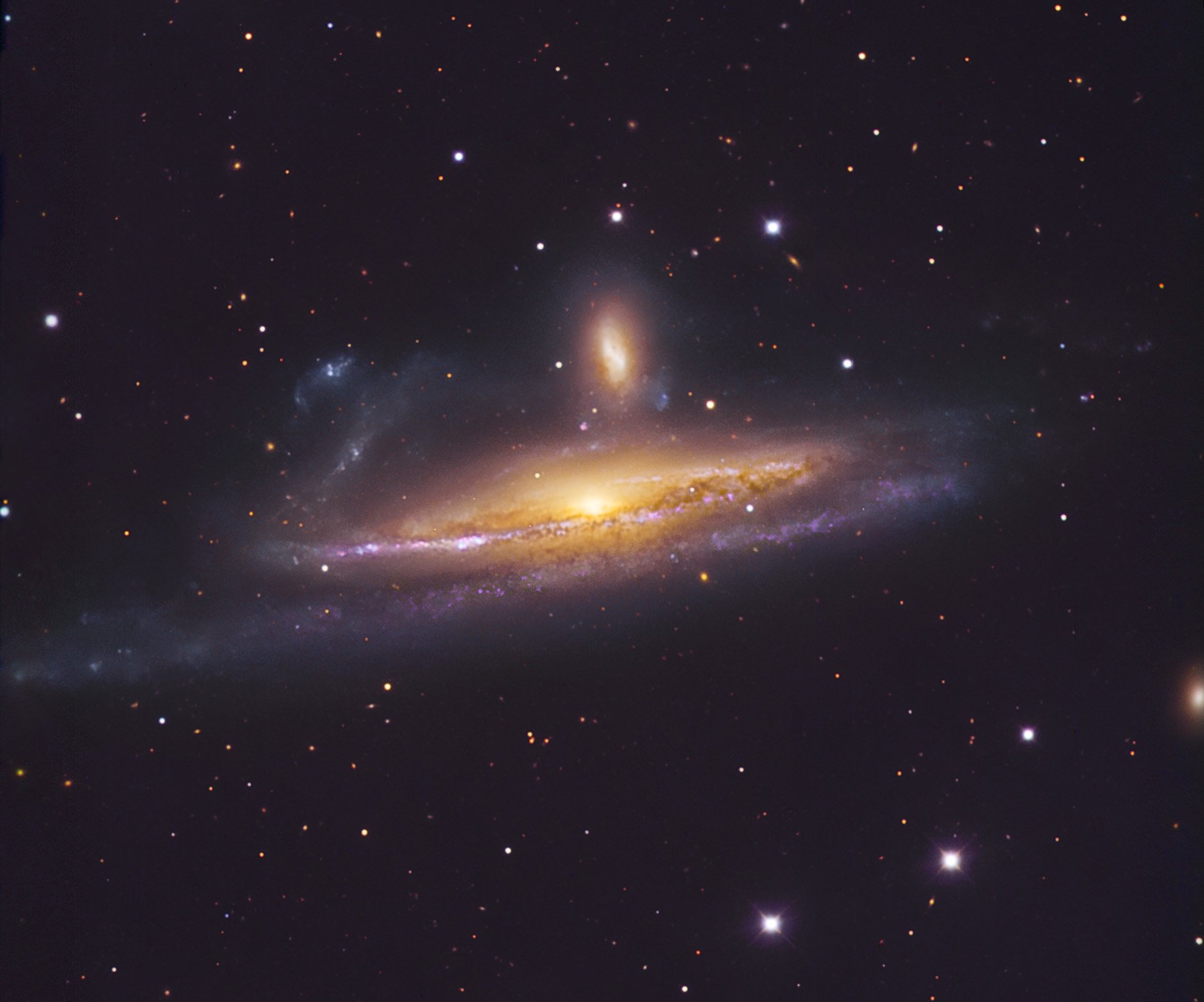 Large galaxies grow by eating small ones. Even our own galaxy practices galactic cannibalism, absorbing small galaxies that get too close and are captured by the Milky Way's gravity. In fact, the practice is common in the universe and well illustrated by this striking pair of interacting galaxies from the banks of the southern constellation Eridanus (The River). Located over 50 million light years away, the large, distorted spiral NGC 1532 is seen locked in a gravitational struggle with dwarf galaxy NGC 1531, a struggle the smaller galaxy will eventually lose. Seen edge-on, spiral NGC 1532 spans about 100,000 light-years. The NGC 1532/1531 pair is thought to be similar to the system of face-on spiral and small companion known as M51, the Whirlpool Galaxy.