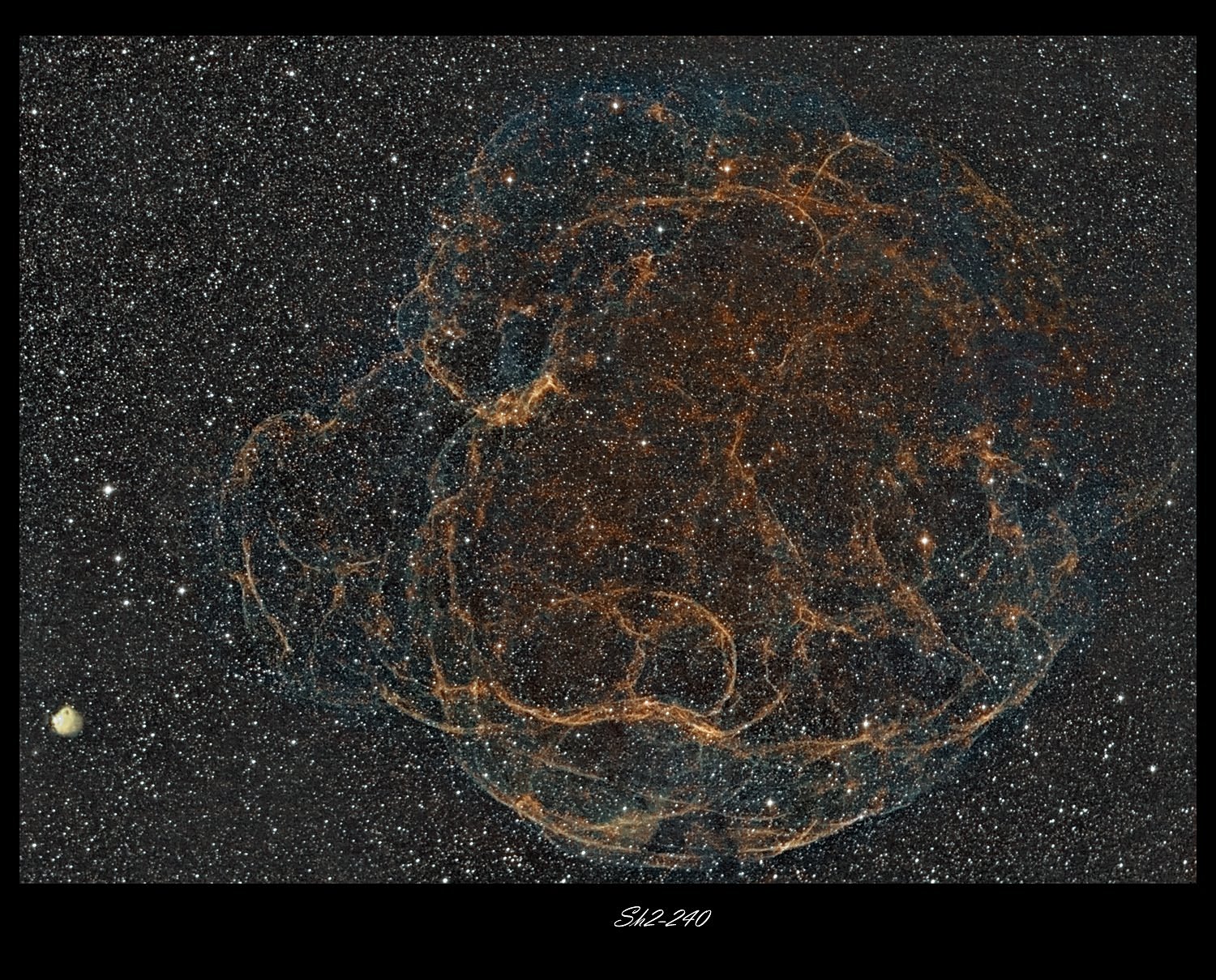 It's easy to get lost following the intricate filaments in this detailed image of faint supernova remnant Simeis 147. Also cataloged as Sh2-240 and seen towards the constellation Taurus, it covers nearly 3 degrees (6 full moons) on the sky. That corresponds to a width of 150 light-years at the stellar debris cloud's estimated distance of 3,000 light-years. The remarkable narrow-band composite image in the Hubble color palette includes emission from hydrogen, sulfur, and oxygen atoms tracing regions of shocked, glowing gas. This supernova remnant has an estimated age of about 40,000 years - meaning light from the massive stellar explosion first reached Earth 40,000 years ago. But this expanding remnant is not the only aftermath. The cosmic catastrophe also left behind a spinning neutron star or pulsar, all that remains of the original star's core.