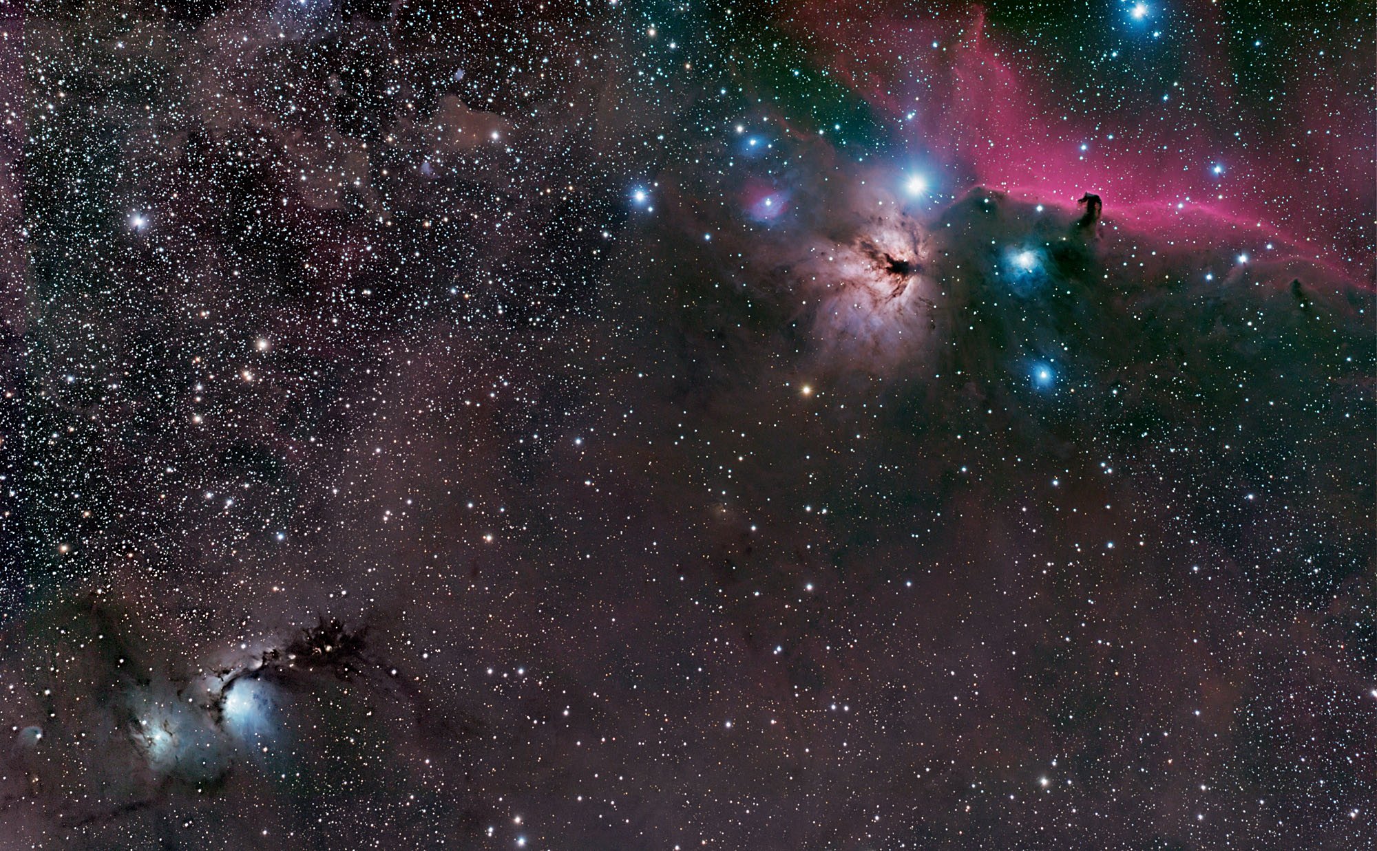 Yesterday's skyscape featured Alnitak, Alnilam, and Mintaka, the stars of Orion's Belt. Today's also presents the easternmost belt star, Alnitak, at the bottom right of the field, surrounded by the well-known Horsehead and Flame nebulae. But this view sweeps farther to the east (left) and north (top) detailing subtler cosmic clouds of gas and dust scattered through the fertile, nebula rich region. The scene is anchored at the top left by the eerie blue glow and ominous dark dust lanes of reflection nebula M78. Like the Horsehead, the Flame, and the Orion Nebula itself, M78 is a readily visible part of the large Orion Molecular Cloud complex some 1,500 light-years distant.