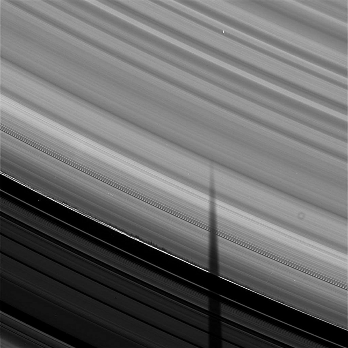 What's causing unusual jagged shadows on Saturn's rings? No one is yet sure. As Saturn nears equinox, its rings increasingly show only their thin edge to the Earth and Sun. As a result, Saturn's moons now commonly cast long shadows onto the rings. An example of this is the elongated vertical shadow of Mimas seen on the above right. The series of shorter, jagged shadows that run diagonally, however, are more unusual. Now Saturn's rings have been known to be made of particles for hundreds of years, but these particles have so far escaped direct imaging. It is therefore particularly exciting that a preliminary hypothesis holds that these jagged shadows are silhouettes of transient groups of ring particles temporarily held close by their own gravity. Future work will surely continue, as the robotic Cassini spacecraft orbiting Saturn that took the above image will continue to photograph Saturn's magnificent rings right through Saturn's equinox this August.