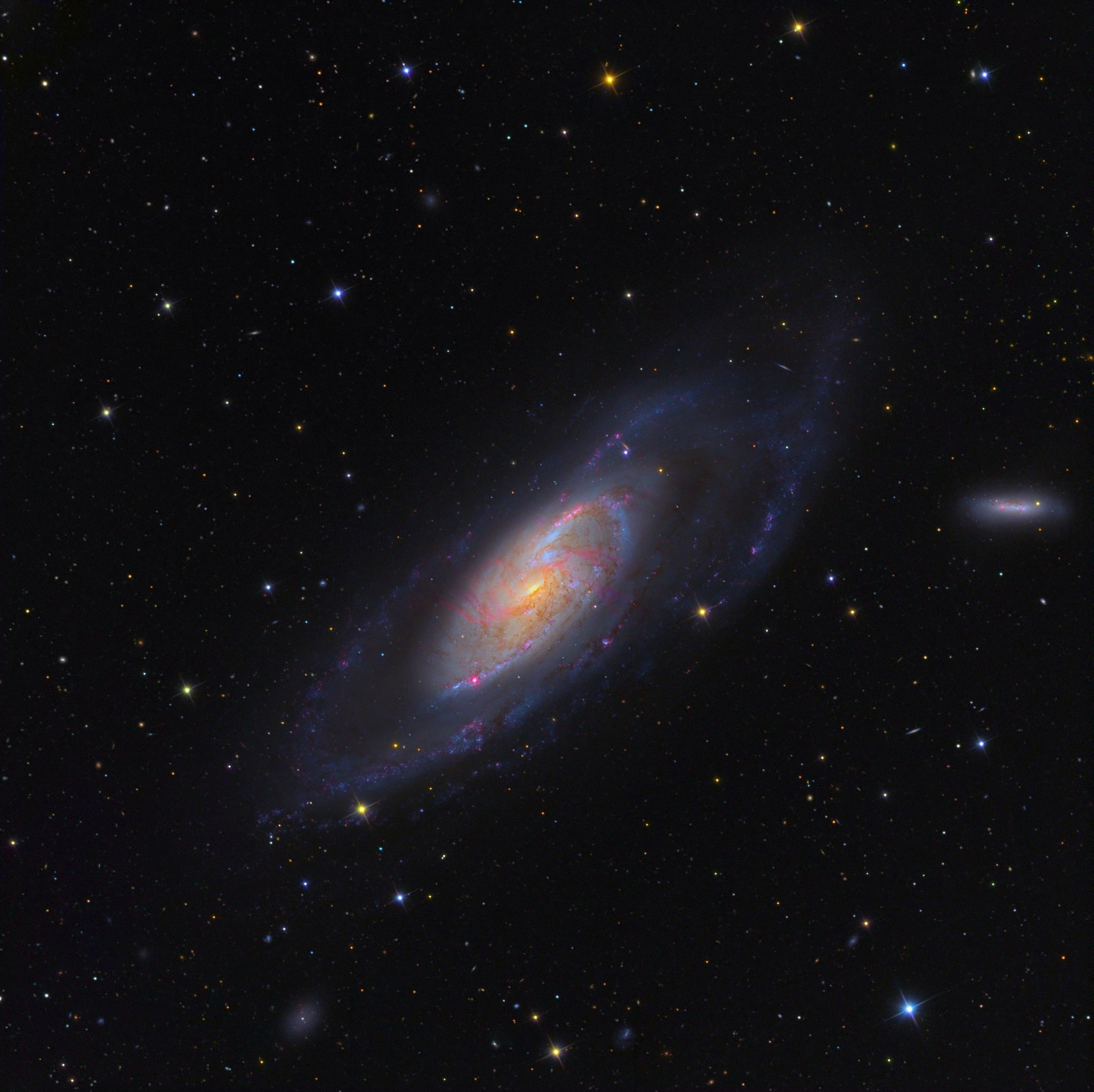 The beautiful Trifid Nebula is a colorful study in cosmic contrasts. Also known as M20, it lies about 5,000 light-years away toward the nebula rich constellation Sagittarius. A star forming region in the plane of our galaxy, the Trifid illustrates three different types of astronomical nebulae; red emission nebulae dominated by light emitted by hydrogen atoms, blue reflection nebulae produced by dust reflecting starlight, and dark nebulae where dense dust clouds appear in silhouette. The bright red emission region, roughly separated into three parts by obscuring, dark dust lanes, lends the Trifid its popular name. In this gorgeous wide view, the red emission is also juxtaposed with the telltale blue haze of reflection nebulae. Pillars and jets sculpted by newborn stars, left of the emission nebula's center, appear in Hubble Space Telescope close-up images of the region. The Trifid Nebula is about 40 light-years across.