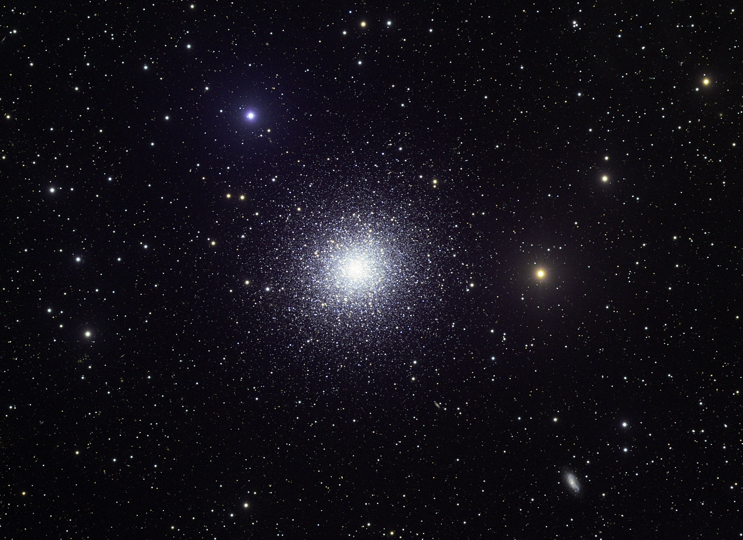 M13 is one of the most prominent and best known globular clusters. Visible with binoculars in the constellation of Hercules, M13 is frequently one of the first objects found by curious sky gazers seeking celestials wonders beyond normal human vision. M13 is a colossal home to over 100,000 stars, spans over 150 light years across, lies over 20,000 light years distant, and is over 12 billion years old. At the 1974 dedication of Arecibo Observatory, a radio message about Earth was sent in the direction of M13. The reason for the low abundance of unusual blue straggler stars in M13 remains unknown.