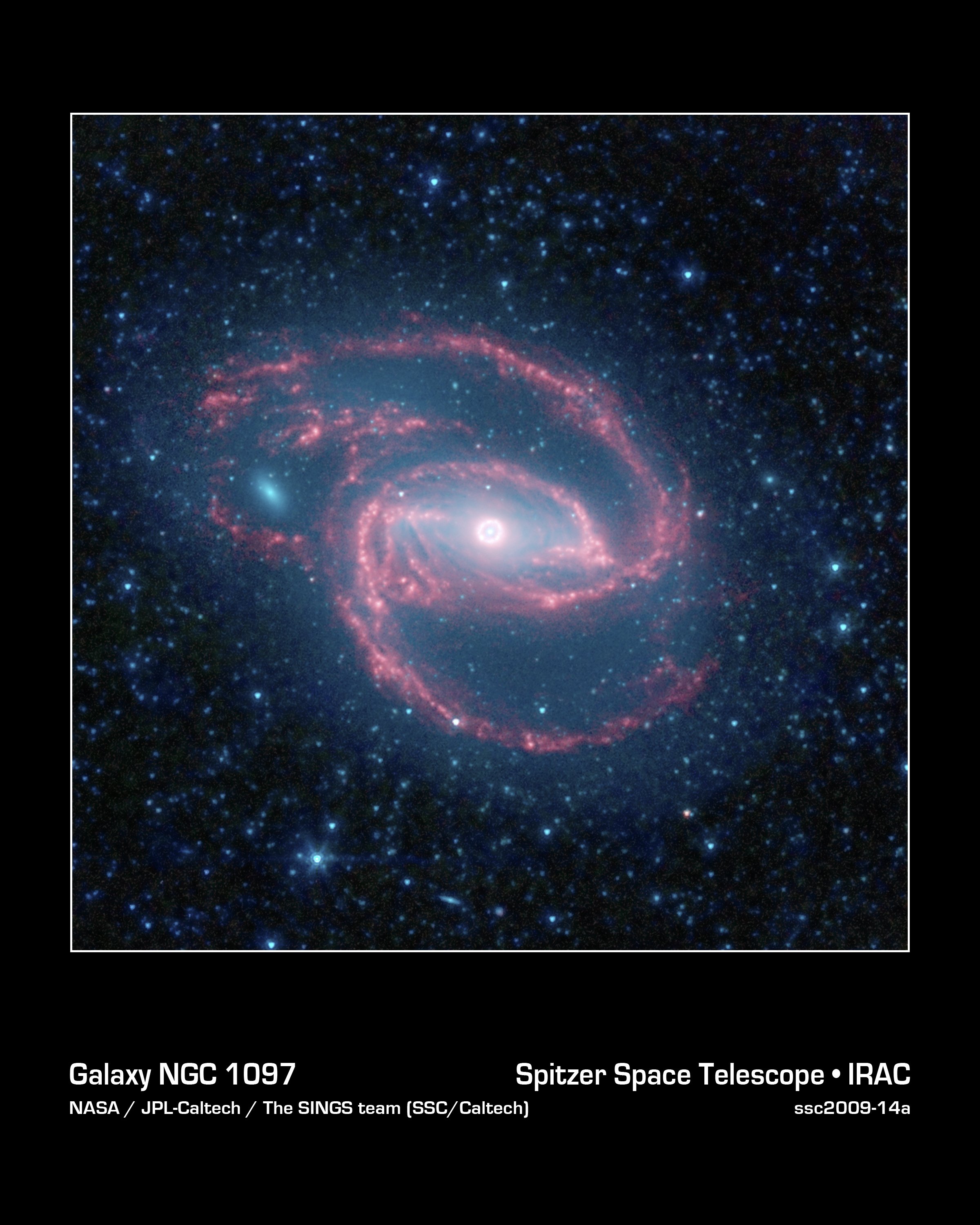 What's happening at the center of spiral galaxy NGC 1097? No one is sure, but it likely involves a supermassive black hole. Matter falling in from a bar of stars and gas across the center is likely being heated by an extremely energetic region surrounding the central black hole. From afar, the entire central region appears in the above false-color infrared image as a mysterious eye. Near the left edge and seen in blue, a smaller companion galaxy is wrapped in the spectacular spiral arms of the large spiral, lit in pink by glowing dust. Currently about 40 thousand light-years from the larger galaxy's center, the gravity of the companion galaxy appears to be reshaping the larger galaxy as it is slowly being destroyed itself. NGC 1097 is located about 50 million light years away toward the constellation of the furnace (Fornax).