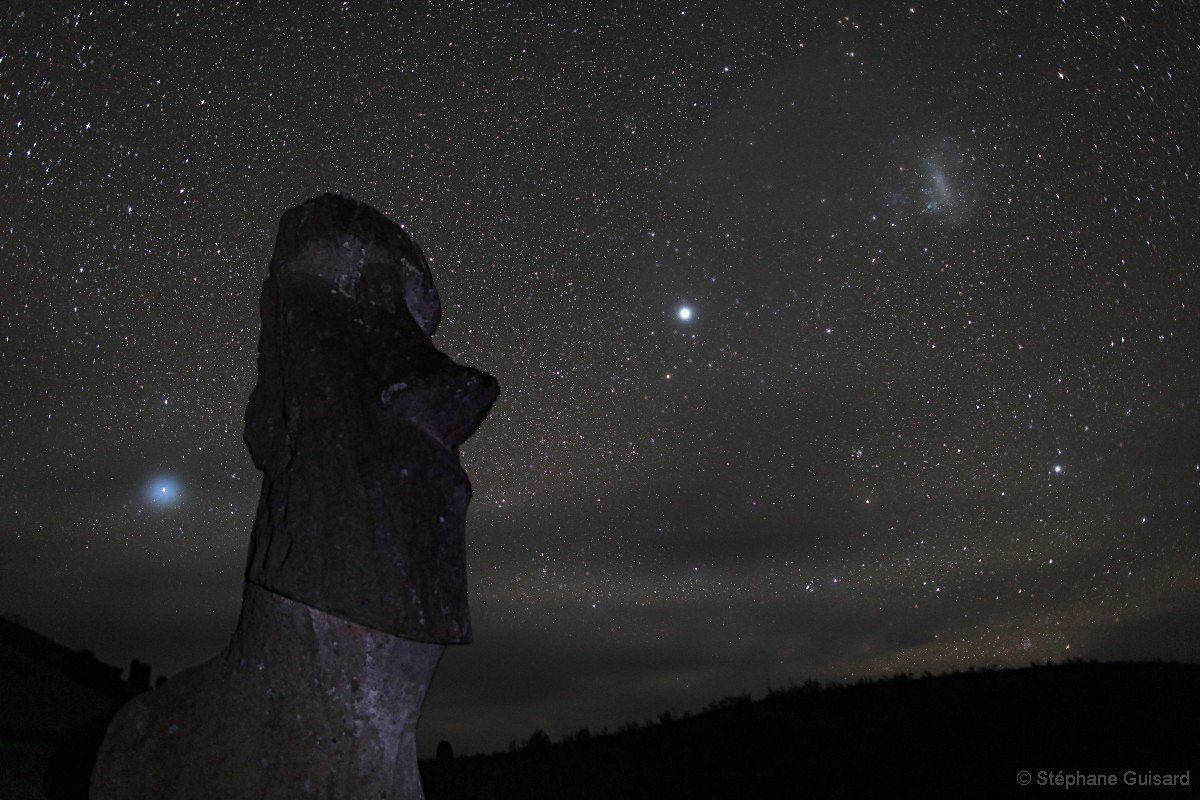 Why were the statues on Easter Island built? No one is sure. What is sure is that over 800 large stone statues exist there. The Easter Island statues, stand, on the average, over twice as tall as a person and have over 200 times as much mass. Few specifics are known about the history or meaning of the unusual statues, but many believe that they were created about 500 years ago in the images of local leaders of a lost civilization. Pictured above, a large stone statue appears to ponder the distant Large Magellanic Cloud before a cloudy sky that features the bright stars Canopus and Sirius.
