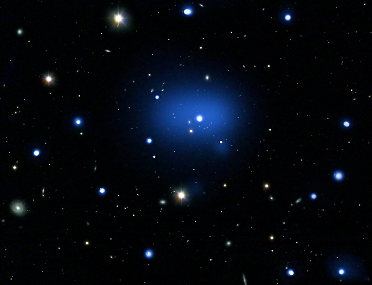 shown above in diffuse blue, superposed on an optical image showing many foreground stars.
