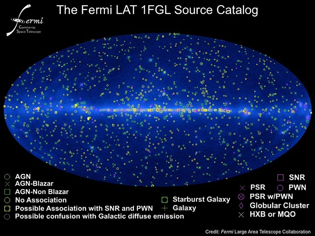 What shines in the gamma-ray sky? The most complete answer yet to that question is offered by the Fermi Gamma-ray Space Telescope's first all-sky catalog. Fermi's sources of cosmic gamma-rays feature nature's most energetic particle accelerators, ultimately producing 100 MeV to 100 GeV photons, photons with more than 50 million to 50 billion times the energy of visible light. Distilled from 11 months of sky survey data using Fermi's Large Area Telescope (LAT), the 1,451 cataloged sources include energetic star burst galaxies and active galactic nuclei (AGN) far beyond the Milky Way. But within our own galaxy are many pulsars (PSR) and pulsar wind nebulae (PWN), supernova remnants (SNR), x-ray binary stars (HXB) and micro-quasars (MQO). Fermi's all sky map is shown centered on the Milky Way with the diffuse gamma-ray emission from the Galactic plane running horizontally through the frame. To locate the cataloged gamma-ray sources, just slide your cursor over the map. For now, 630 of the sources cataloged at gamma-ray energies remain otherwise unidentified, not associated with sources detected at lower energies.