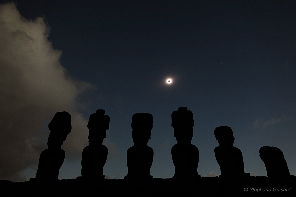 Makemake, a god in Easter Island mythology, may have smiled for a moment as clouds parted long enough to reveal this glimpse of July 11's total solar eclipse to skygazers. In the foreground of the dramatic scene, the island's famous large, monolithic statues (Moai) share a beachside view of the shimmering solar corona and the darkened daytime sky. Other opportunities to see the total phase of this eclipse of the Sun were also hard to come by. Defined by the dark part of the Moon's shadow, the path of totality tracked eastward across the southern Pacific Ocean, only making significant landfall at Mangaia (Cook Islands) and Easter Island (Isla de Pascua), ending shortly after reaching southern Chile and Argentina. But a partial eclipse phase could be enjoyed over a broader region, including many southern Pacific islands and wide swath of South America.