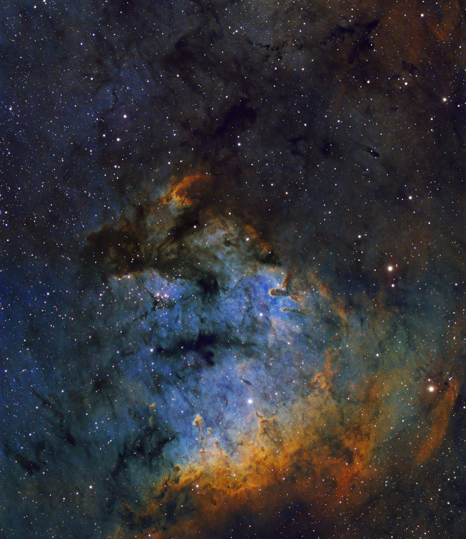 Cradled in cosmic dust and glowing hydrogen, stellar nurseries in Orion the Hunter lie at the edge of a giant molecular cloud some 1,500 light-years away. Spanning nearly 25 degrees, this breath-taking vista stretches across the well-known constellation from head to toe (left to right). The Great Orion Nebula, the closest large star forming region, is right of center. To its left are the Horsehead Nebula, M78, and Orion's belt stars. Sliding your cursor over the picture will also find red giant Betelgeuse at the hunter's shoulder, bright blue Rigel at his foot, and the glowing Lambda Orionis (Meissa) nebula at the far left, near Orion's head. Of course, the Orion Nebula and bright stars are easy to see with the unaided eye, but dust clouds and emission from the extensive interstellar gas in this nebula-rich complex, are too faint and much harder to record. In this mosaic of broadband telescopic images, additional image data acquired with a narrow hydrogen alpha filter was used to bring out the pervasive tendrils of energized atomic hydrogen gas and the arc of the giant Barnard's Loop.