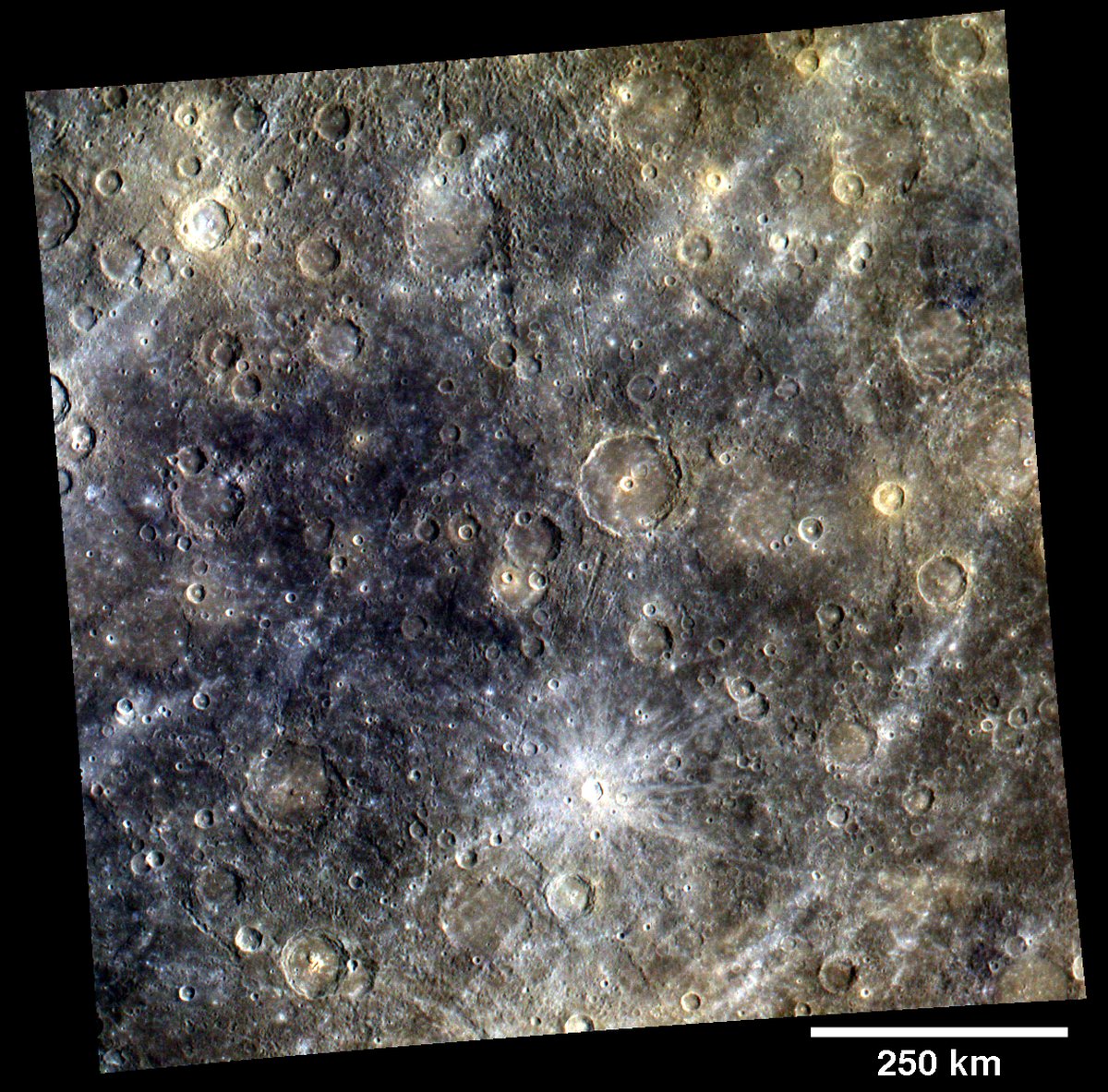 The robotic MESSENGER spacecraft recently completed over 100 orbits of Mercury. MESSENGER's cameras have recorded detailed pictures utilizing eight different colors across visible and near infrared light, exploring the surface composition and looking for clues to the history and evolution of the solar system's innermost planet. This sharp image combines three of the MESSENGER wide angle camera's colors, but in exaggerated fashion. Otherwise, to the unaided human eye, Mercury's surface colors would appear comparatively muted. The image is about 1,000 kilometers across and features as small as a single kilometer are discernible at the original resolution. Today, the MESSENGER project will release new images and science findings from the first spacecraft to orbit Mercury.