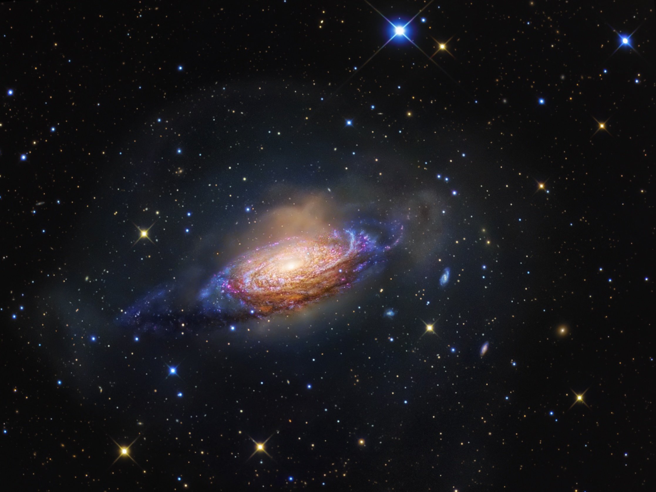 Gorgeous spiral galaxy NGC 3521 is a mere 35 million light-years away, toward the constellation Leo. Relatively bright in planet Earth's sky, NGC 3521 is easily visible in small telescopes but often overlooked by amateur imagers in favor of other Leo spiral galaxies, like M66 and M65. It's hard to overlook in this colorful cosmic portrait, though. Spanning some 50,000 light-years the galaxy sports characteristic patchy, irregular spiral arms laced with dust, pink star forming regions, and clusters of young, blue stars. Remarkably, this deep image also finds NGC 3521 embedded in gigantic bubble-like shells. The shells are likely tidal debris, streams of stars torn from satellite galaxies that have undergone mergers with NGC 3521 in the distant past.