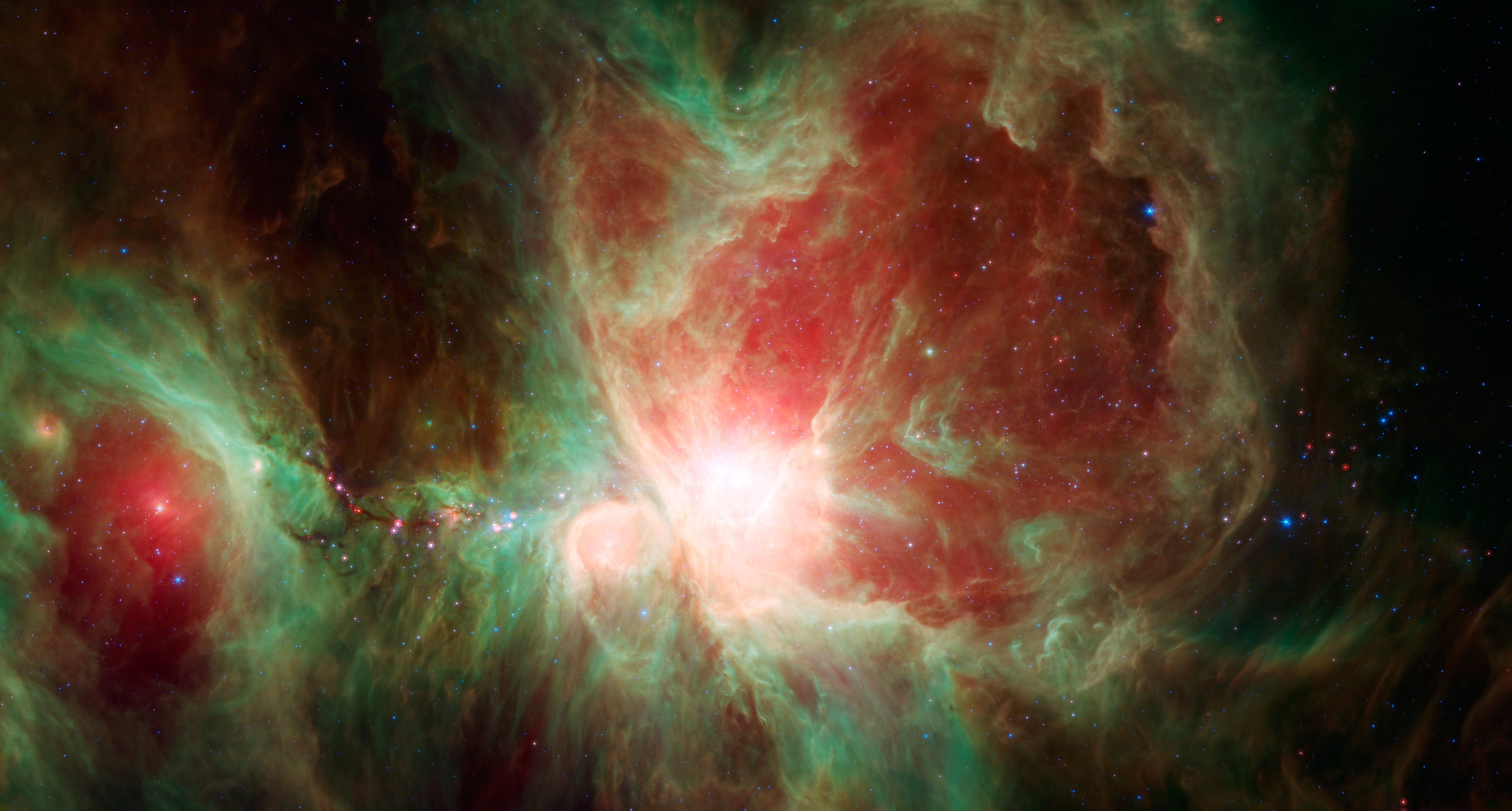 Few cosmic vistas excite the imagination like the Orion Nebula, an immense stellar nursery some 1,500 light-years away. This stunning false-color view spans about 40 light-years across the region, constructed using infrared data from the Spitzer Space Telescope. Compared to its visual wavelength appearance, the brightest portion of the nebula is likewise centered on Orion's young, massive, hot stars, known as the Trapezium Cluster. But the infrared image also detects the nebula's many protostars, still in the process of formation, seen here in red hues. In fact, red spots along the dark dusty filament to the left of the bright cluster include the protostar cataloged as HOPS 68, recently found to have crystals of the silicate mineral olivine within its protostellar envelope.