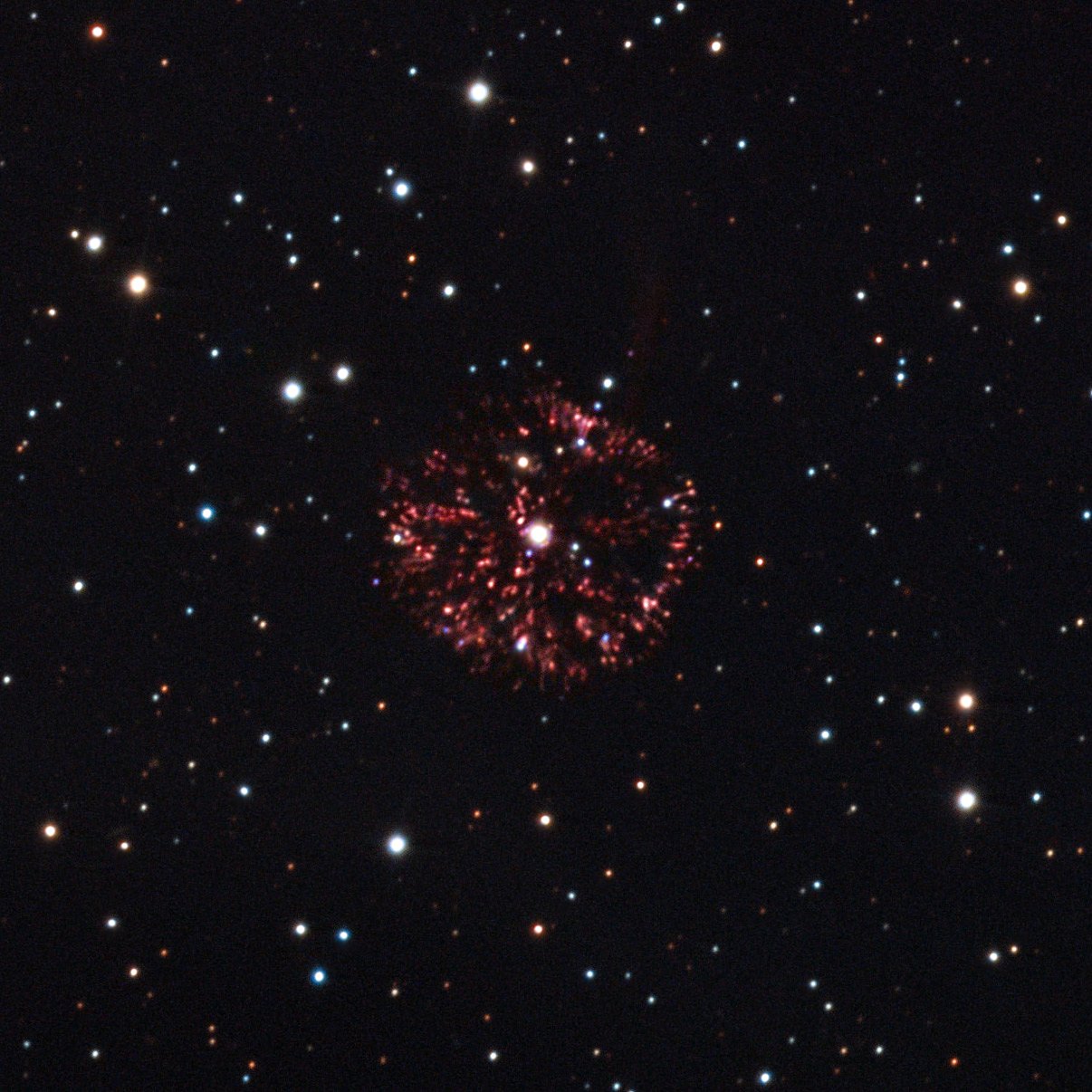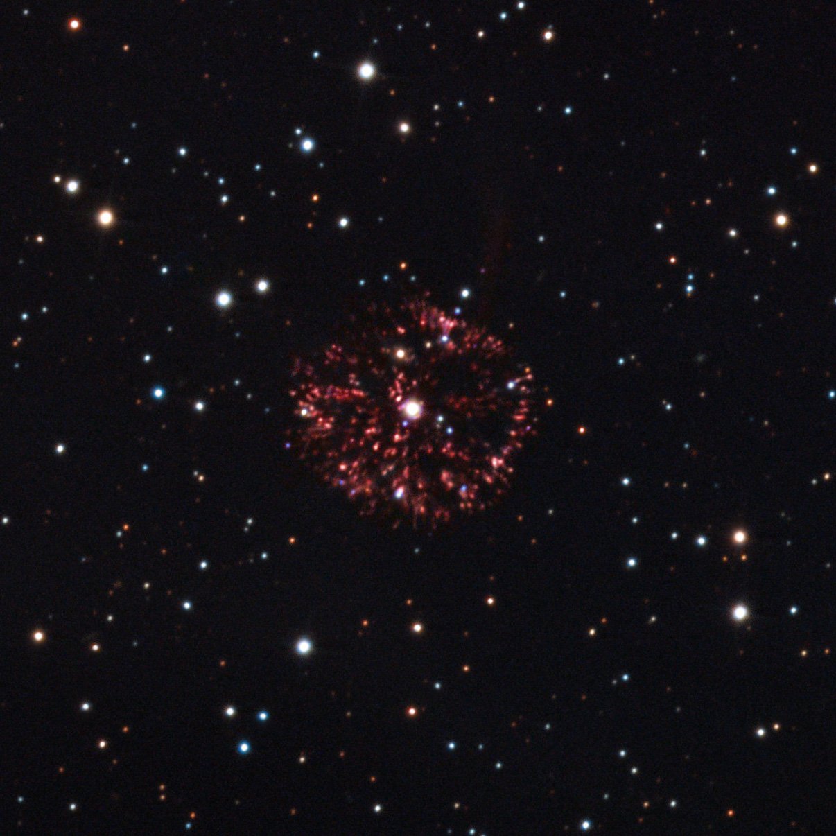 Early in the 20th century, GK Persei briefly became one of the brightest stars in planet Earth's sky, an event known as Nova Persei 1901. Documented in this modern day composite of two images from 2003 and 2011 the ejecta from the explosion, popularly called the Firework Nebula, continues to expand into space. These images are part of a time lapse video tracking the nebula's expansion over the last 17 years. About 1500 light-years away, the nebula is still just under a light-year in diameter. GK Per and similar cataclysmic variable stars known as classical novae are understood to be binary systems consisting of a compact white dwarf star and swollen cool giant star in a close orbit. The build up of mass transferred to the surface of the white dwarf from the giant star through an accretion disk eventually triggers a thermonuclear outburst, blasting the stellar material into space without destroying the white dwarf star. With a 2 day orbital period, the GK Per system has produced much smaller outbursts in recent years.