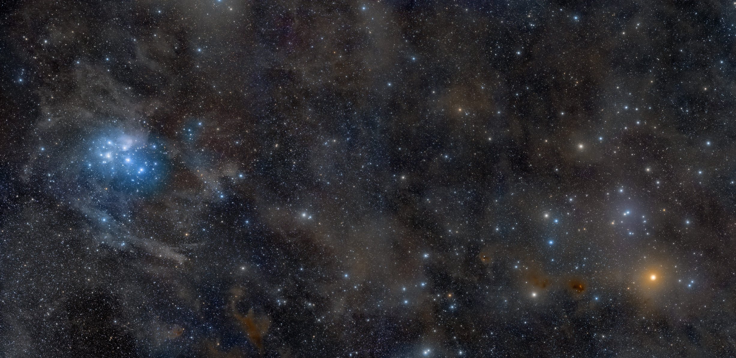 This cosmic vista stretches almost 20 degrees across the gentle constellation Taurus. It begins at the Pleiades and ends at the Hyades, two of the best known star clusters in planet Earth's sky. At left, the lovely Pleiades star cluster is about 400 light-years away. In a familiar celestial scene, the cluster stars shine through dusty clouds that scatter blue starlight. At right, the V-shaped Hyades cluster looks more spread out compared to the compact Pleiades and lies much closer, 150 light-years distant. Of course, the Hyades cluster stars seem anchored by bright Aldebaran, a red giant star with a yellowish appearance. But Aldebaran actually lies only 65 light-years away, by chance along the line of sight to the Hyades cluster. Faint dust clouds found near the edge of the Taurus Molecular Cloud are also evident throughout the remarkable 12 panel mosaic. The wide field of view includes the youthful star T Tauri and Hind's variable nebula about four degrees left of Aldebaran on the sky.