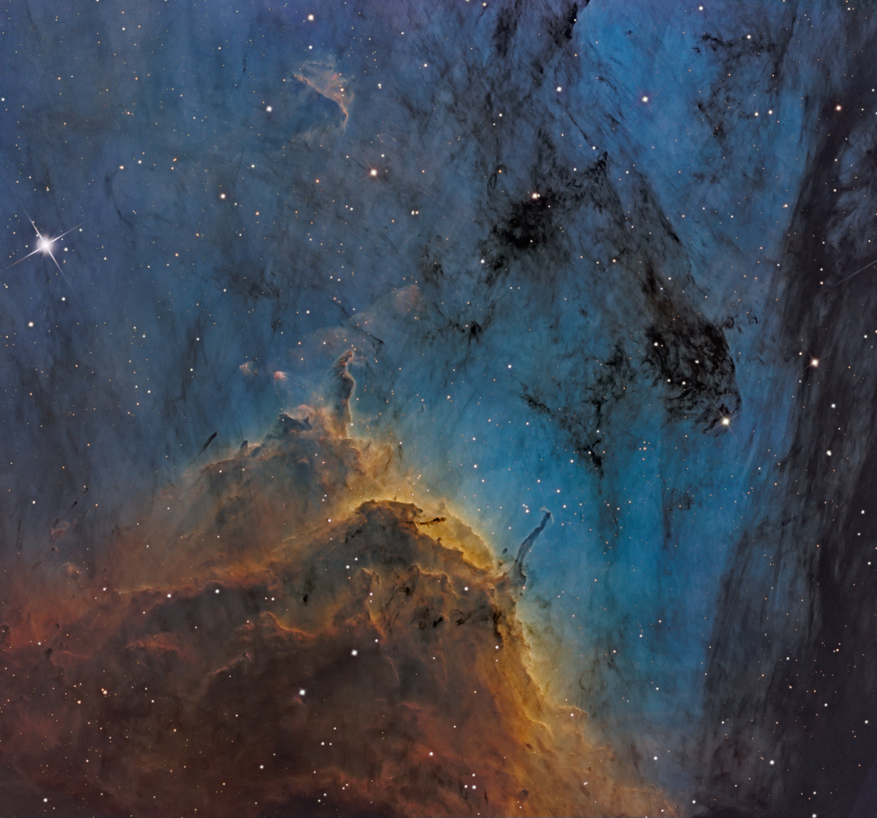 The prominent ridge of emission featured in this vivid skyscape is designated IC 5067. Part of a larger emission nebula with a distinctive shape, popularly called The Pelican Nebula, the ridge spans about 10 light-years and follows the curve of the cosmic pelican's head and neck. The Pelican Nebula close-up was constructed from narrowband data mapping emission from sulfur, hydrogen, and oxygen atoms to red, green, and blue colors. Fantastic, dark shapes inhabiting the view are clouds of cool gas and dust sculpted by energetic radiation from young, hot, massive stars. But stars are also forming within the dark shapes. In fact, twin jets emerging from the tip of the long, dark tendril below center are the telltale signs of an embedded protostar cataloged as Herbig-Haro 555. The Pelican Nebula itself, also known as IC 5070, is about 2,000 light-years away. To find it, look northeast of bright star Deneb in the high flying constellation Cygnus.