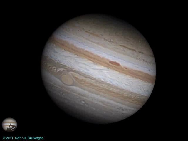Güneş Sistemi'nin en büyük gezegeninin zarif dönüşünü izleyin. Jüpiter'in gizemli atmosferindeki pek çok ilginç ayrıntı, koyu bantlar ve açık kuşaklar da dahil olmak üzere, detaylı biçimde takip edilebilir. Dikkatle bakarsanız, ekvatora yakın merkezî bulutların kutuplara doğru olan bulutlardan biraz daha hızlı döndüğünü görürsünüz. Ünlü Büyük Kırmızı Leke başlangıçta seçiliyor; ancak kısa süre sonra dönerek görüş alanından çıkıyor ve filmin sonlarına doğru yeniden kadraja giriyor. Zaman zaman daha küçük fırtına sistemleri de beliriyor. Jüpiter ne kadar büyük olsa da, yalnızca 10 saatte bir tur atıyor. Buna karşılık küçük Dünya'mızın bir dönüşünü tamamlaması 24 saat sürüyor. Yukarıdaki yüksek çözünürlüklü zaman atlamalı film, Fransız Pireneleri'ndeki Pic du Midi Gözlemevi'nde bulunan 1 metrelik teleskopla son bir yıl içinde kaydedildi. Hidrojen ve helyum gazları renksiz olduğundan ve Jüpiter'in geniş atmosferinin büyük bölümünü bu elementler oluşturduğundan, Jüpiter bulutlarında gördüğümüz renkleri hangi iz elementlerin ürettiği hâlâ bilinmiyor. Anket: Geçen haftanın APOD'larından favorilerinizi seçin