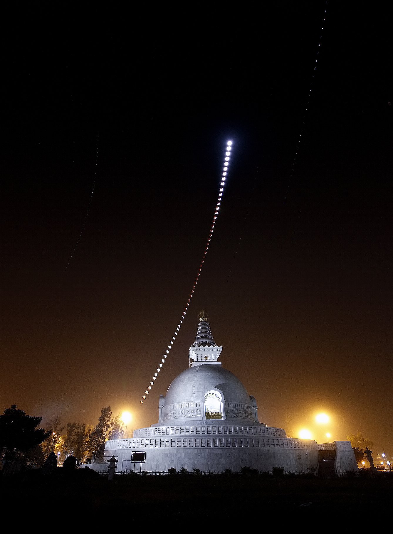 The dark, inner shadow of planet Earth is called the umbra. Shaped like a cone extending into space, it has a circular cross section most easily seen during a lunar eclipse. For example, last Saturday the Full Moon slid across the southern half of Earth's umbral shadow, entertaining moonwatchers around much of the planet. In the total phase of the eclipse, the Moon was completely within the umbra for 51 minutes. Recorded from Beijing, China, this composite eclipse image uses successive pictures from totality (center) and partial phases to trace out a large part of the umbra's curved edge. Background stars are visible in the darker eclipse phases. The result shows the relative size of the shadow's cross section at the distance of the Moon, as well as the Moon's path through Earth's umbra.