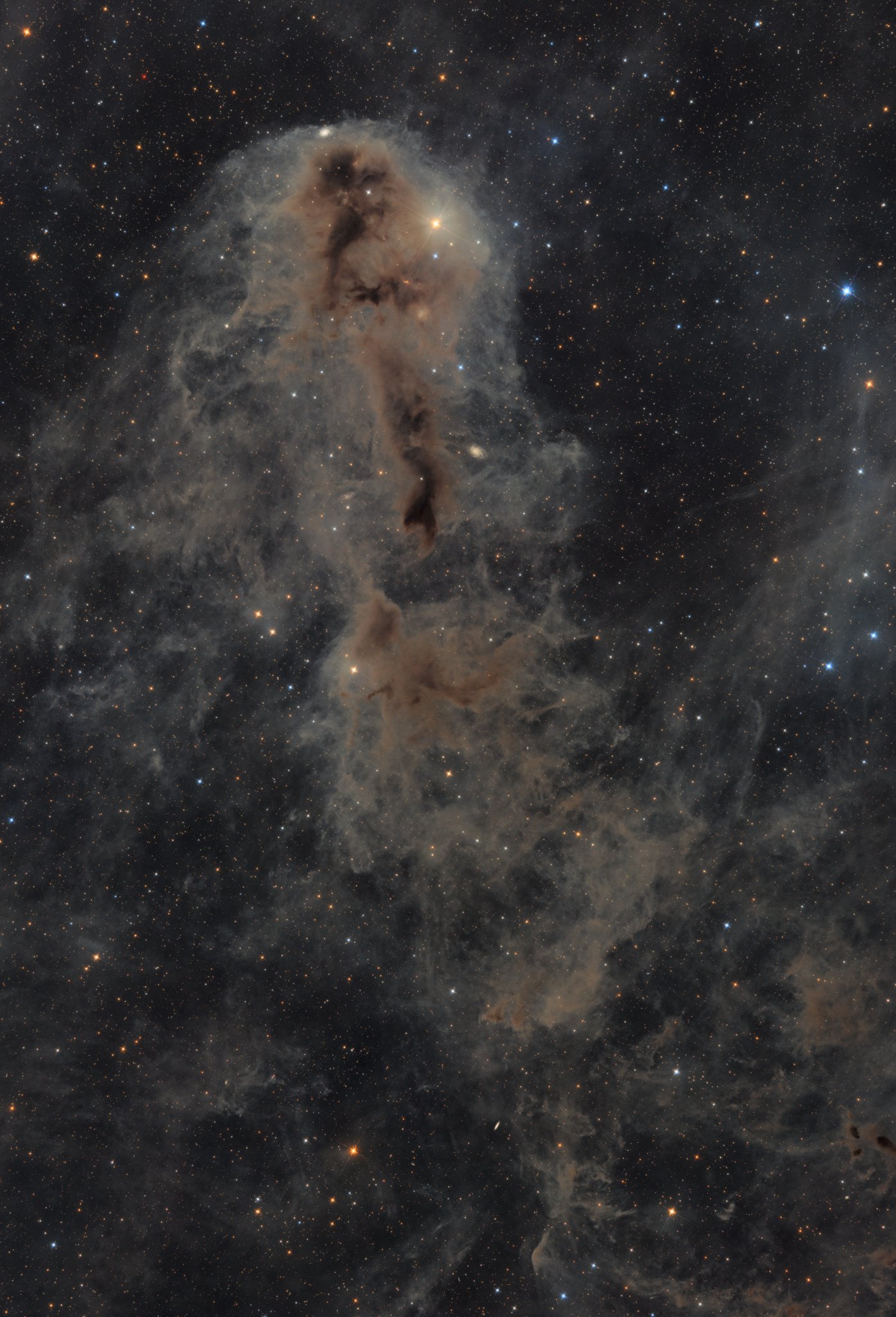 Where did all the stars go? What used to be considered a hole in the sky is now known to astronomers as a dark molecular cloud. Here, a high concentration of dust and molecular gas absorb practically all the visible light emitted from background stars. The eerily dark surroundings help make the interiors of molecular clouds some of the coldest and most isolated places in the universe. One of the most notable of these dark absorption nebulae is a cloud toward the constellation Ophiuchus known as Barnard 68, pictured above. That no stars are visible in the center indicates that Barnard 68 is relatively nearby, with measurements placing it about 500 light-years away and half a light-year across. It is not known exactly how molecular clouds like Barnard 68 form, but it is known that these clouds are themselves likely places for new stars to form. In fact, Barnard 68 itself has been found likely to collapse and form a new star system. It is possible to look right through the cloud in infrared light.