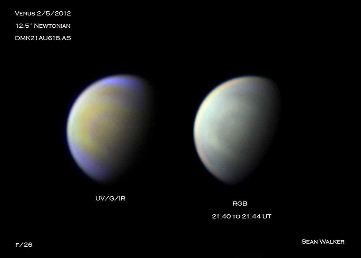 Brilliant Venus now shines in western skies at twilight. Seen as the prominent evening star, the planet is a tantalizing celestial beacon even for casual skygazers. Venus can offer less than satisfying telescopic views though. The planet is shrouded in reflective clouds that appear bright but featureless at the eyepiece. Still, careful imaging with a series of color filters, as used in these composite images, can reveal subtle cloud patterns. Captured early last month from a backyard observatory in Manchester, New Hampshire, USA, the images are based on video camera frames. The data was recorded through near-ultraviolet, green, and near-infrared filters (left), and red, green, and blue filters while Venus stood high above the western horizon just before sunset. This season's evening apparition of Venus is the best one for northern hemisphere observers in 7 years. It will ultimately end with a solar transit of the planet, the last one to occur in your lifetime, on June 5/6.