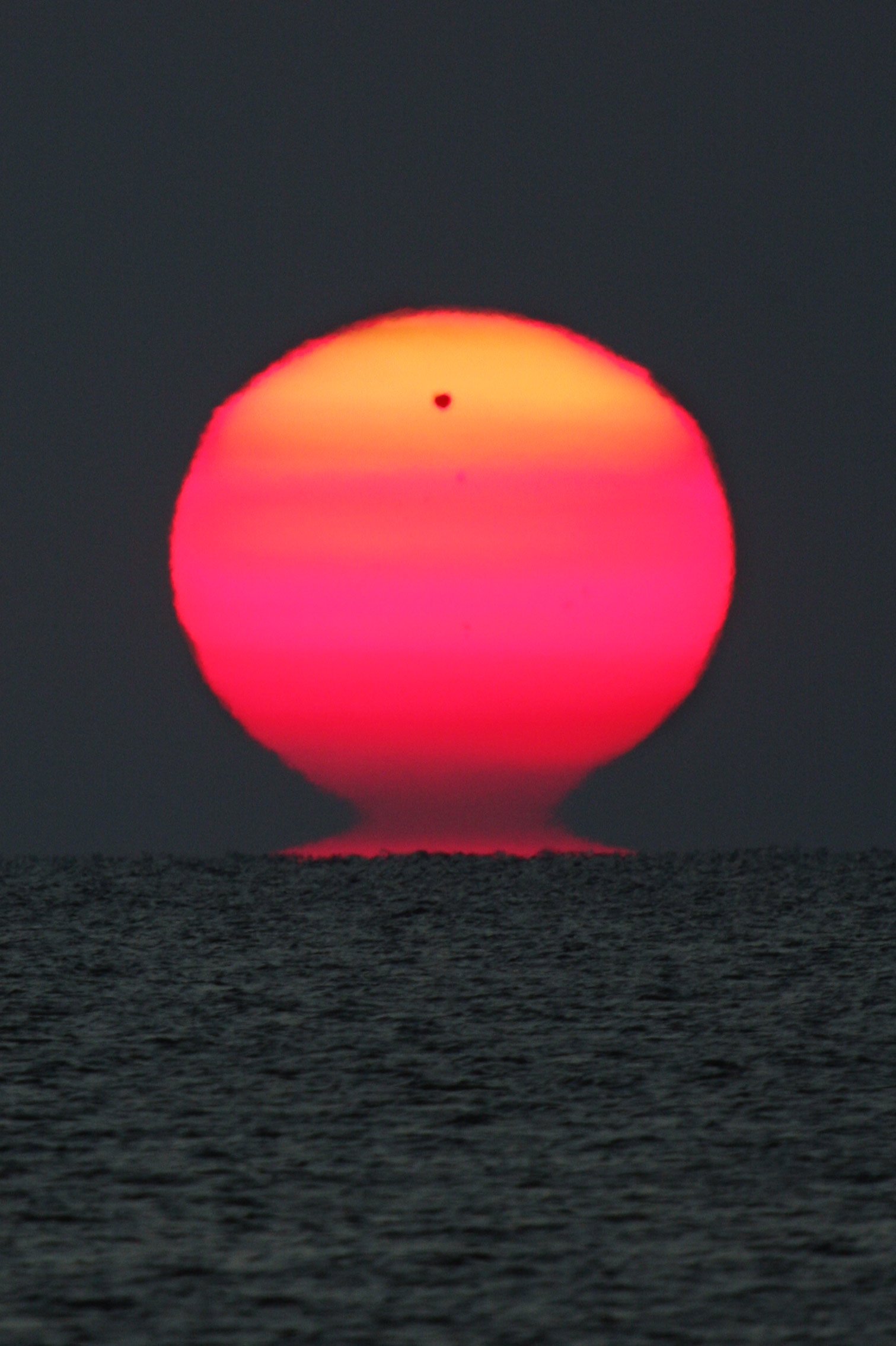 This dramatic telephoto view across the Black Sea on June 6 finds Venus rising with the Sun, the planet in silhouette against a ruddy and ragged solar disk. Of course, the reddened light is due to scattering in planet Earth's atmosphere and the rare transit of Venus didn't influence the strangely shaped and distorted Sun. In fact, seeing the Sun in the shape of an Etruscan Vase is relatively common, especially compared to Venus transits. At sunset and sunrise, the effects of atmospheric refraction enhanced by long, low, sight lines and strong atmospheric temperature gradients produce the visual distortions and mirages. That situation is often favored by a sea horizon.