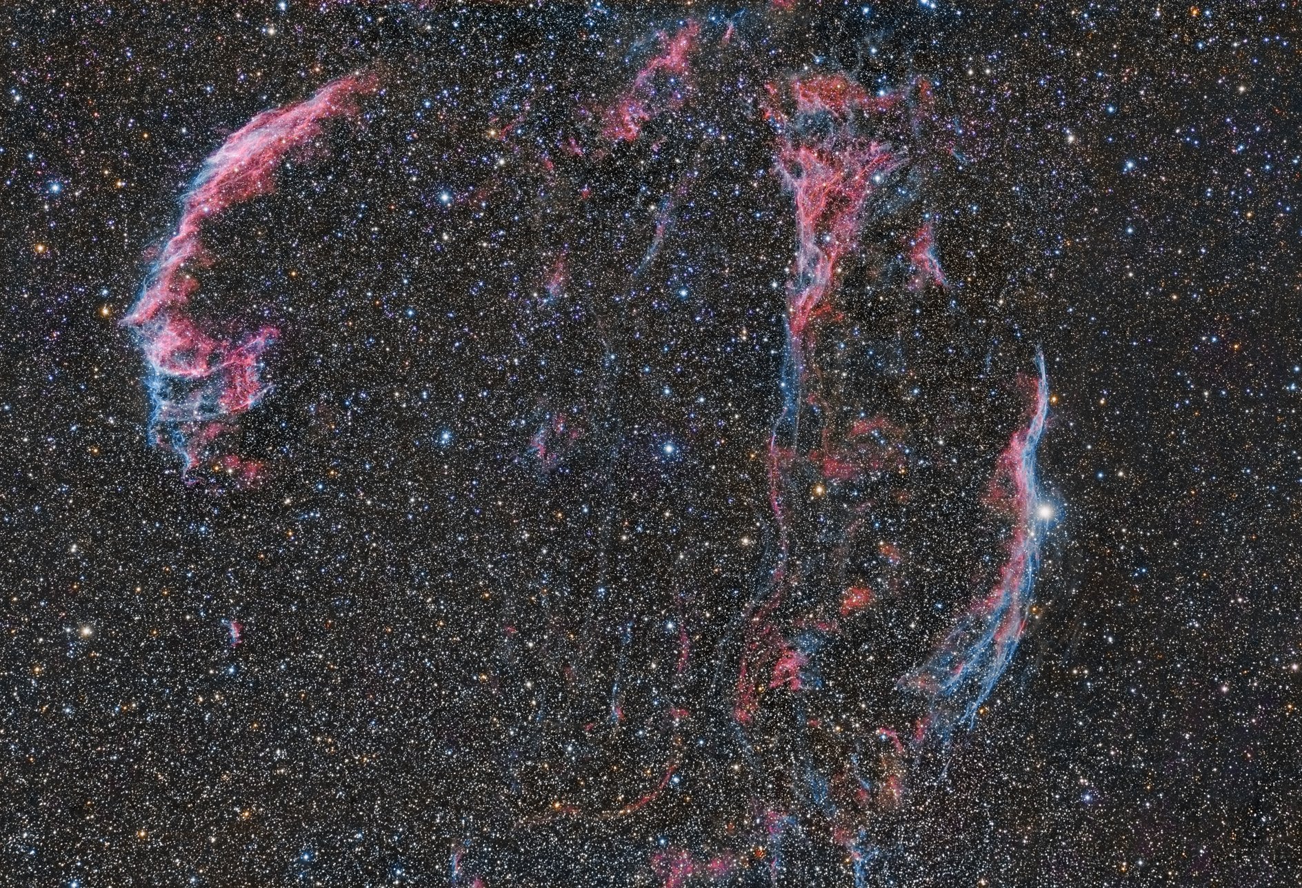 Wisps like this are all that remain visible of a Milky Way star. About 9,000 years ago that star exploded in a supernova leaving the Veil Nebula, also known as the Cygnus Loop. At the time, the expanding cloud was likely as bright as a crescent Moon, remaining visible for weeks to people living at the dawn of recorded history. Today, the resulting supernova remnant has faded and is now visible only through a small telescope directed toward the constellation of the Swan (Cygnus). The remaining Veil Nebula is physically huge, however, and even though it lies about 1,400 light-years distant, it covers over five times the size of the full Moon. In images like this of the complete Veil Nebula, studious readers should be able to identify several of the individual filaments. A bright wisp at the right is known as the Witch's Broom Nebula.