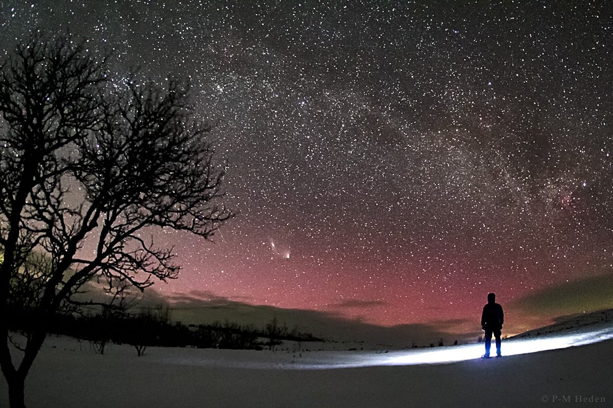 This beautiful, bright, spiral galaxy is Messier 64, often called the Black Eye Galaxy or the Sleeping Beauty Galaxy for its heavy-lidded appearance in telescopic views. M64 is about 17 million light-years distant in the otherwise well-groomed northern constellation Coma Berenices. In fact, the Red Eye Galaxy might also be an appropriate moniker in this colorful composition of narrow and wideband images. The enormous dust clouds obscuring the near-side of M64's central region are laced with the telltale reddish glow of hydrogen associated with star forming regions. But they are not this galaxy's only peculiar feature. Observations show that M64 is actually composed of two concentric, counter-rotating systems. While all the stars in M64 rotate in the same direction as the interstellar gas in the galaxy's central region, gas in the outer regions, extending to about 40,000 light-years, rotates in the opposite direction. The dusty eye and bizarre rotation is likely the result of a billion year old merger of two different galaxies.