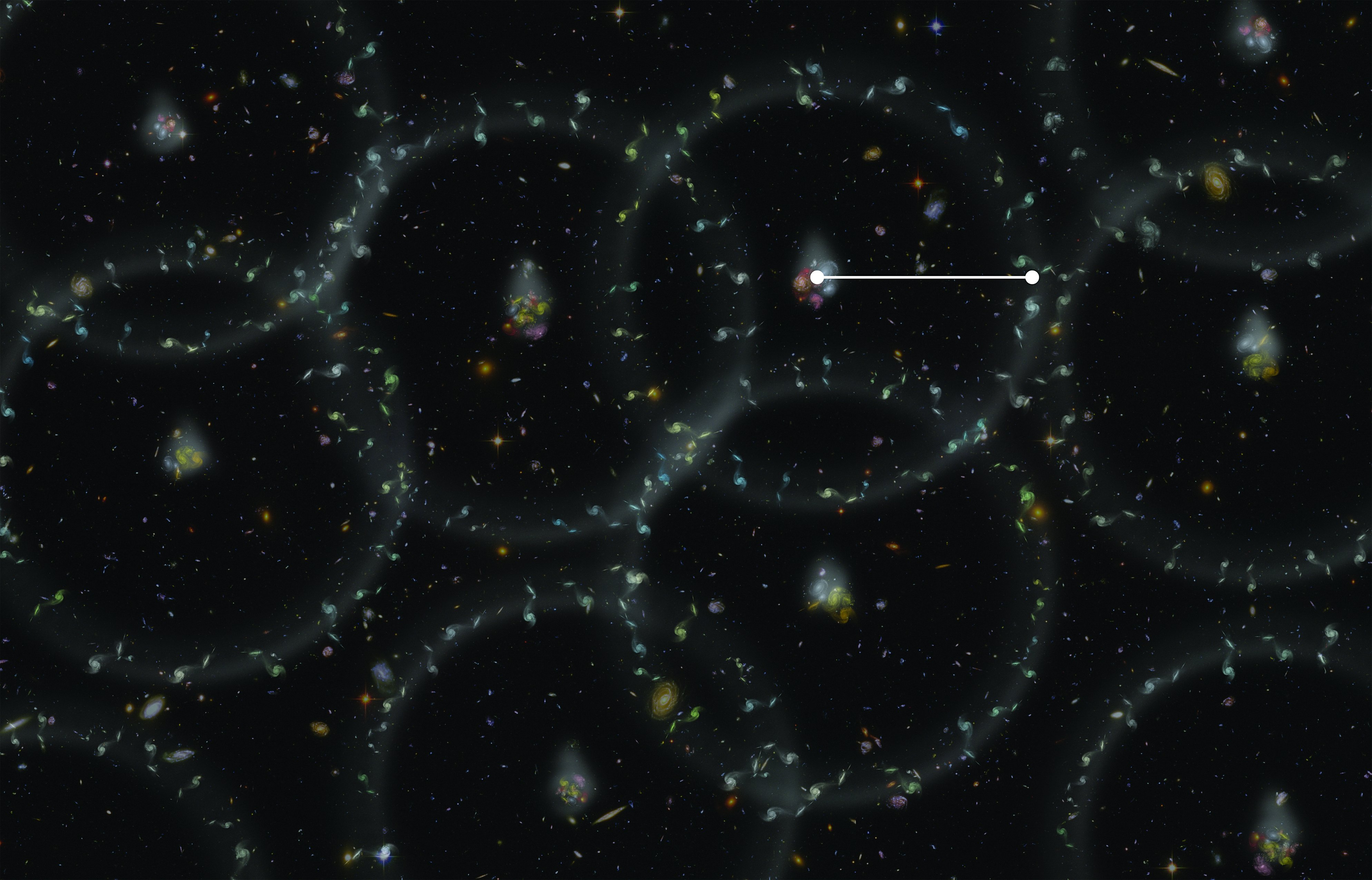 Bundan milyarlarca yıl sonra bu iki galaksiden geriye biri kalacak. O zamana kadar, NGC 2207 ve IC 2163 sarmal galaksileri birbirlerini yavaşça çekecek, madde gelgitleri, şoklanmış gaz tabakaları, karanlık toz şeritleri, yıldız oluşum patlamaları ve etrafa savrulan yıldız akımları oluşturacak. Astronomlar, soldaki daha büyük galaksi olan NGC 2207'nin, sonunda sağdaki daha küçük galaksi olan IC 2163'ü içine alacağını öngörüyor. Yaklaşık 40 milyon yıl önce zirveye ulaşan son yakınlaşmada, küçük galaksi saat yönünün tersine hareket ediyor ve şu anda büyük galaksinin biraz gerisinde yer alıyor. Yıldızlar arasındaki mesafe o kadar büyüktür ki galaksiler çarpıştığında, içlerindeki yıldızlar genellikle birbirleriyle çarpışmaz.