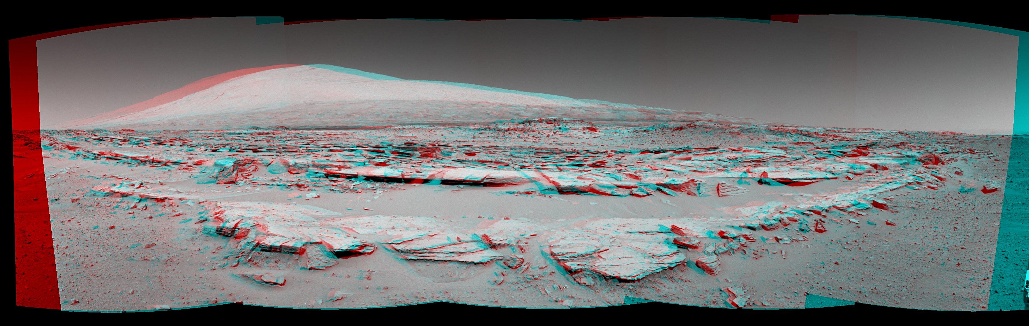 Get out your red/blue glasses (red for the left eye) and look out over this expansive martian landscape. The panoramic stereo view is composed of images from the roving Curiosity's Navcam taken at a rest stop during a 100 meter drive on Sol 548 (February 19). The 5.5 kilometer high peak of Mount Sharp, also known as Aeolis Mons, is on the horizon, its base a destination for Curiosity. In the foreground are rows of striated rocks along the Junda outcrop. Centered toward the south-southeast the scene spans 160 degrees. (Another Navcam image here looks back along Curiosity's route at the end of the Sol's drive on Mars.)