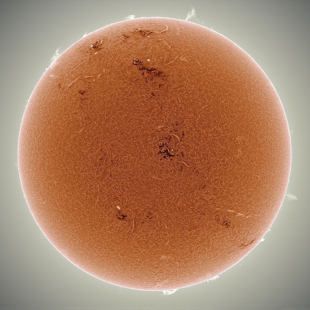 limb darkening. Just over the Sun's edges, several filamentary prominences protrude, while prominences on the Sun's face are seen as light streaks. Possibly the most visually interesting of all are the magnetically tangled active regions containing relatively cool sunspots, seen as white dots. Currently at