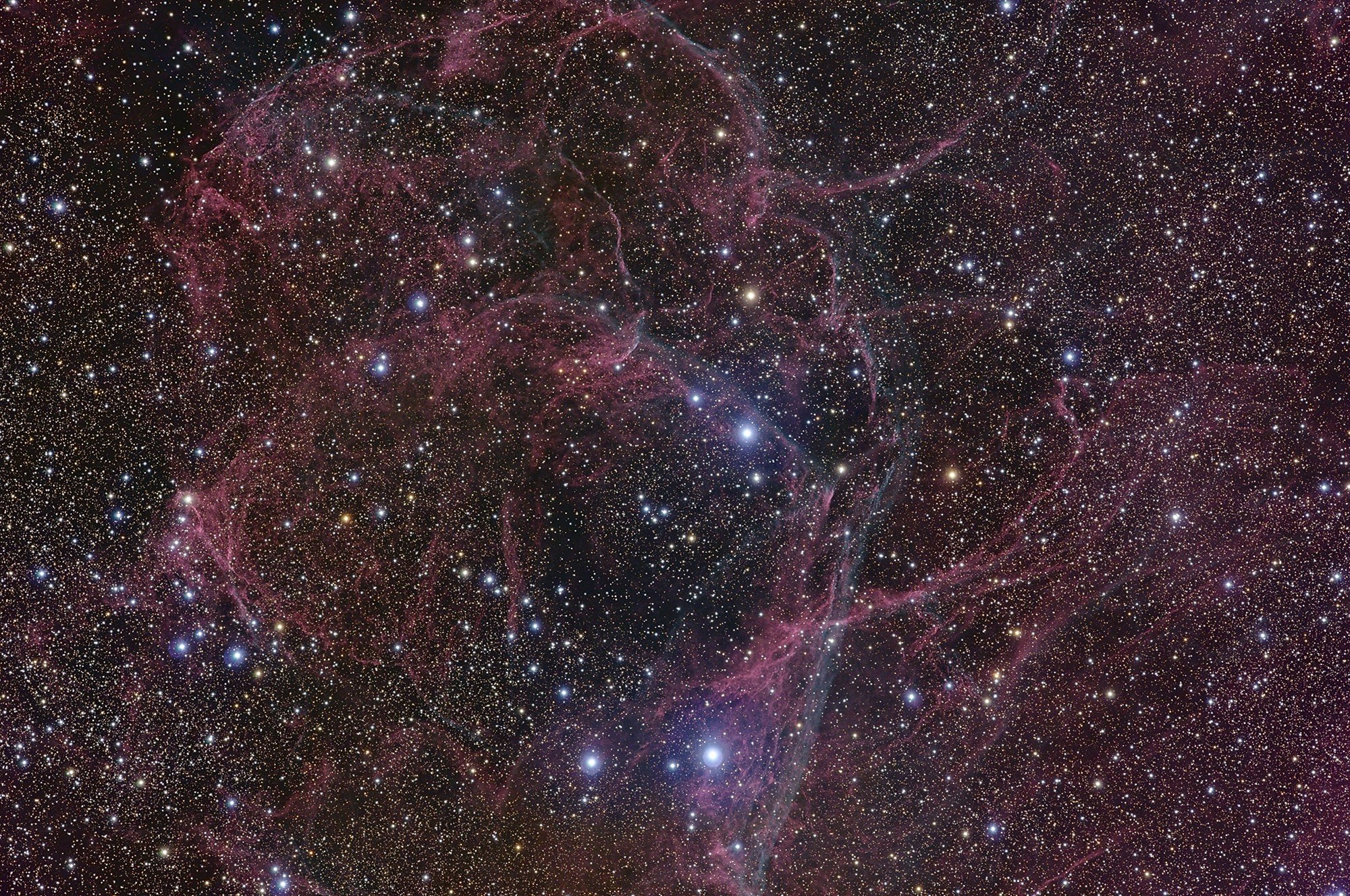 The plane of our Milky Way Galaxy runs through this complex and beautiful skyscape. At the northwestern edge of the constellation Vela (the Sails) the telescopic frame is over 10 degrees wide, centered on the brightest glowing filaments of the Vela Supernova Remnant, an expanding debris cloud from the death explosion of a massive star. Light from the supernova explosion that created the Vela remnant reached Earth about 11,000 years ago. In addition to the shocked filaments of glowing gas, the cosmic catastrophe also left behind an incredibly dense, rotating stellar core, the Vela Pulsar. Some 800 light-years distant, the Vela remnant is likely embedded in a larger and older supernova remnant, the Gum Nebula