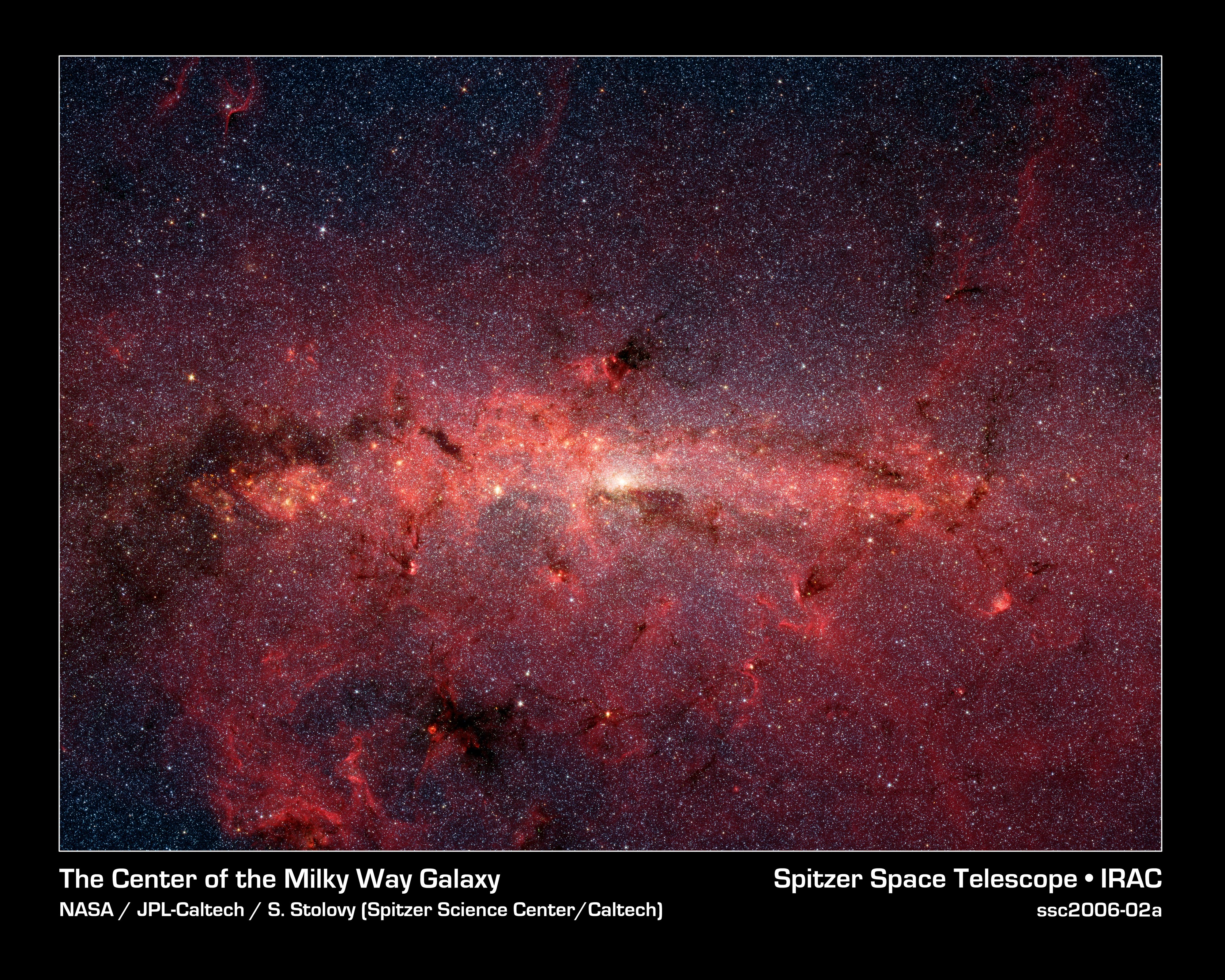 Samanyolu Gökadamızın merkezi, optik teleskopların meraklı bakışlarından; görüşü perdeleyen toz ve gaz bulutları yüzünden saklı kalır. Ama bu çarpıcı manzarada, Spitzer Uzay Teleskobu’nun kızılötesi kameraları, tozun büyük bölümünü delip geçerek kalabalık galaksi merkezi bölgesinin yıldızlarını ortaya çıkarıyor. Pek çok küçük kareden oluşturulmuş bir mozaik olan ayrıntılı sahte renkli görüntü, yaşlı ve serin yıldızları mavimsi tonlarda gösteriyor. Kırmızımsı parlayan toz bulutlarıysa, yıldız doğumevlerindeki genç ve sıcak yıldızlarla ilişkili. Samanyolu’nun tam merkezinin ancak yakın zamanda yeni doğmuş yıldızlar oluşturabildiği anlaşıldı. Galaksi merkezi, Yay takımyıldızı doğrultusunda, yaklaşık 26.000 ışık yılı uzaklıkta bulunuyor. Bu mesafede, bu fotoğrafın kapsadığı alan yaklaşık 900 ışık yılı.